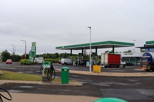 A number of proposals were put forward by Scot Sheridan Developments for these plots of land with the first coming in 2001 for a filling station and a drive-thru restaurant and another in 2003 for a three-storey, 50-bed hotel. These facilities were eventually built, with the Travelodge hotel opened on 20 December 2004 by John MacDougall MP. The forecourt opened under BP branding in early 2005; it went on to gain M&S Simply Food branding in 2007.