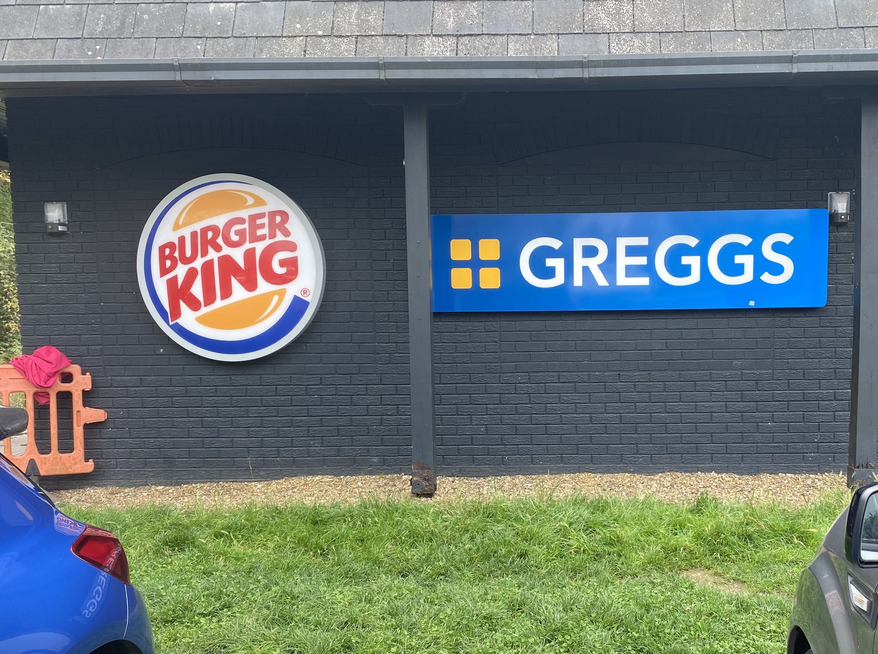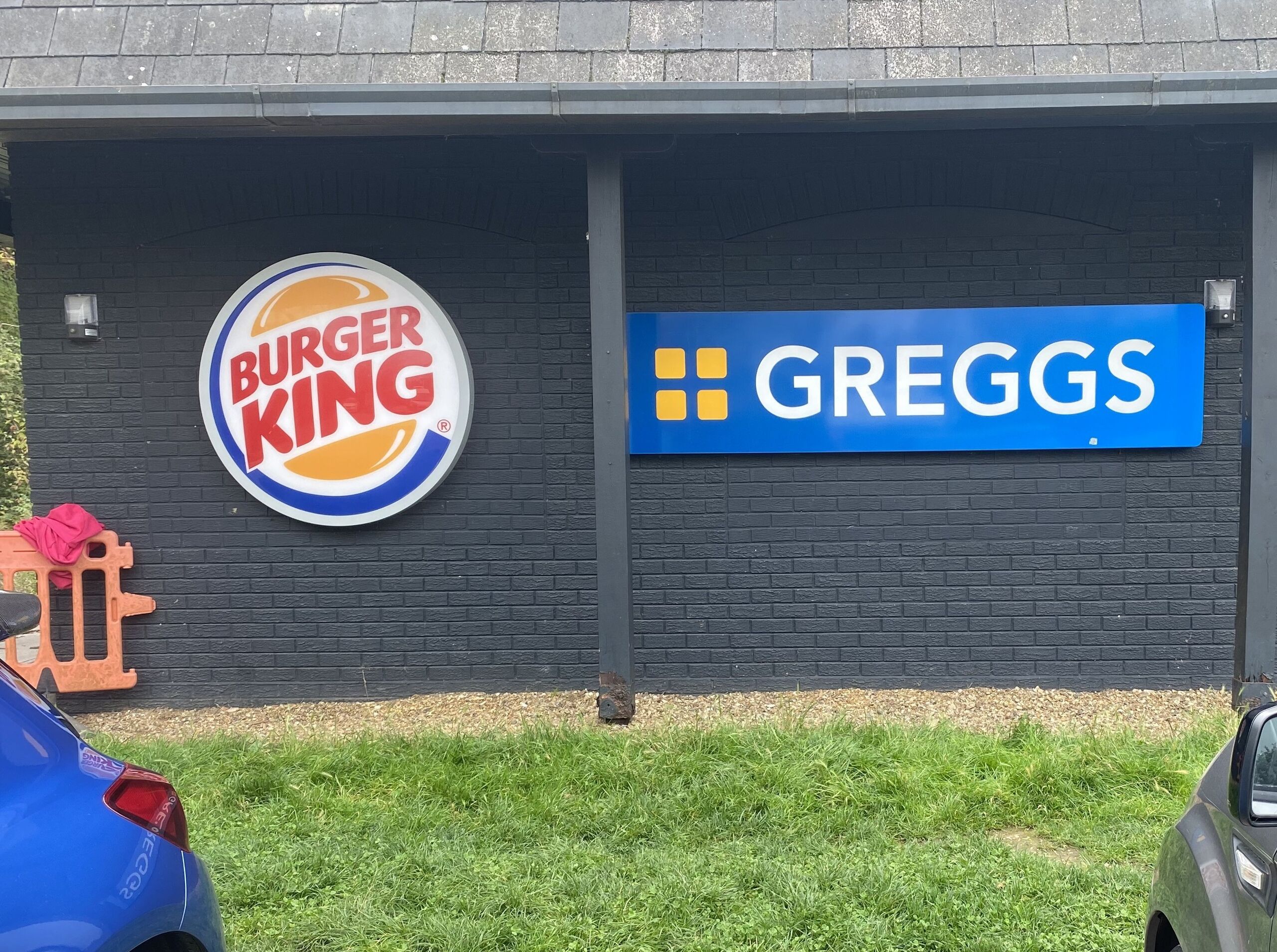 Dual Burger King and Greggs branding, as seen on an external side of the main building.