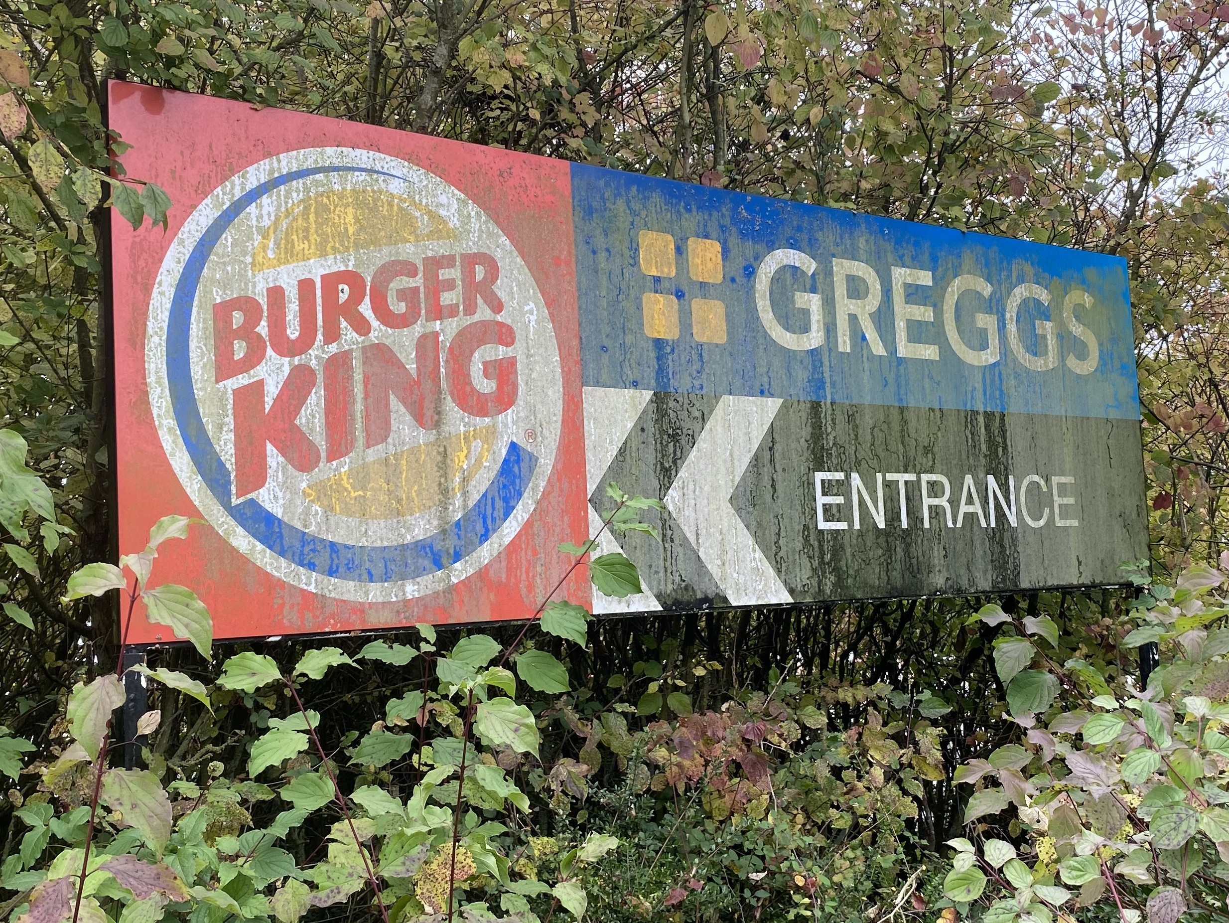 A dirty-looking 'entrance sign' at Beacon Hill, complete with dual Burger King and Greggs branding.