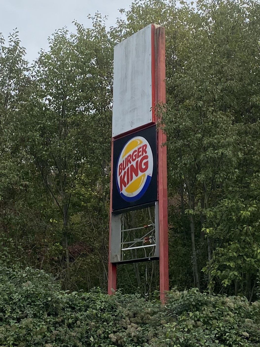 A totem pole at Beacon Hill, which now only contains a piece of Burger King branding, and some now-defunct Little Chef branding elements above and below it.