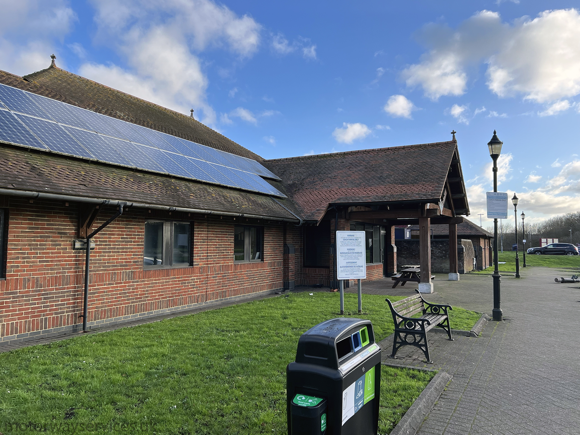 Detail of the country-style building at Clacket Lane eastbound, with red brick, the overhanging roof, homely streetlamps and a village bench.