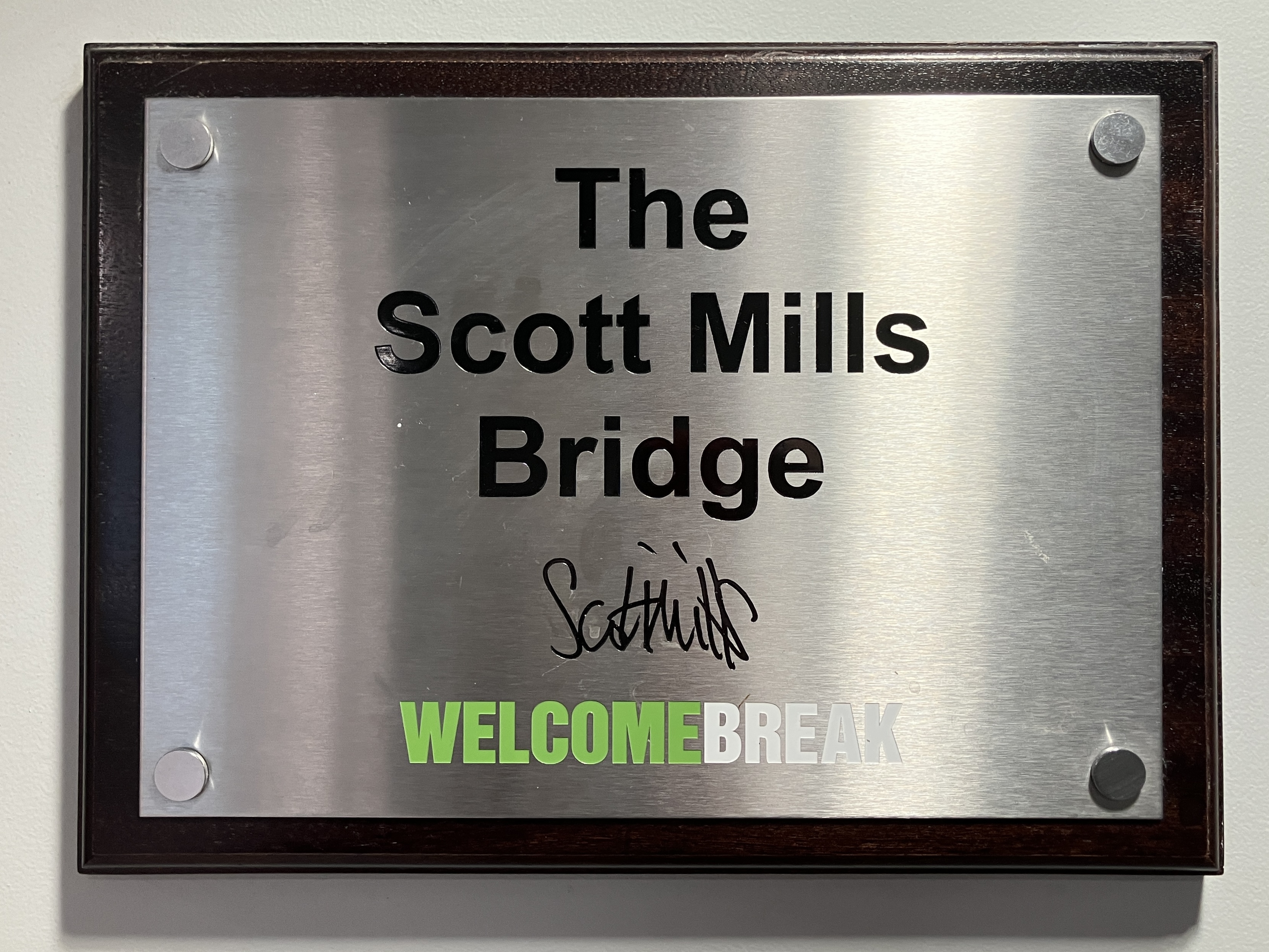 The Scott Mills Bridge plaque, situated on the northbound side commemorating the naming of the bridge.