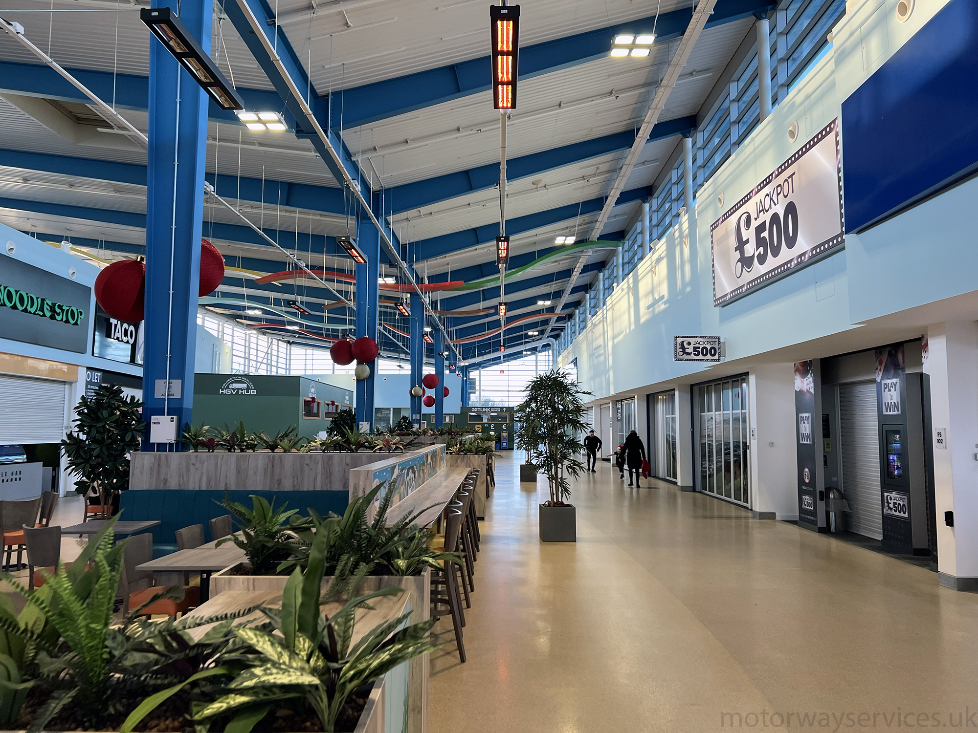 Inside the long building at Folkestone services, with a small seating area and some evidence of Christmas.