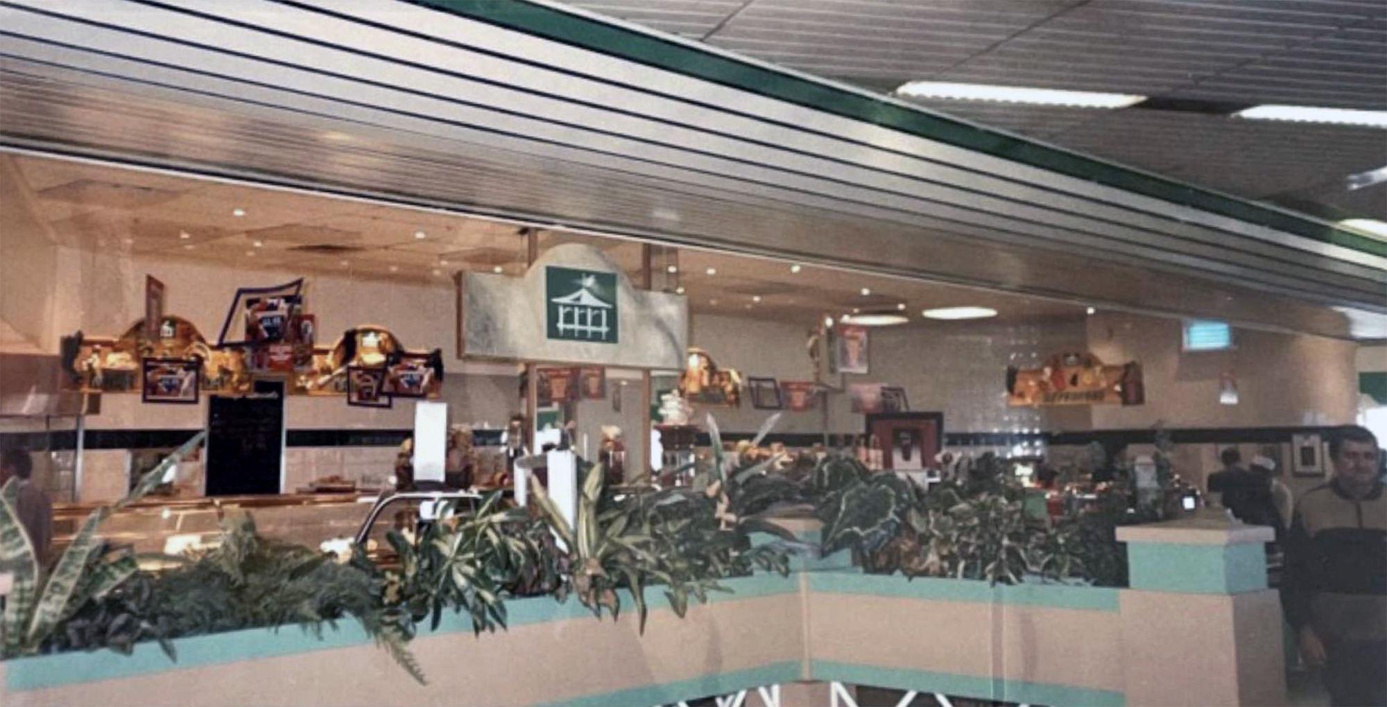 The temporary northbound Pavilion Restaurant counter, with fake plants at the front. See also File:Forton northbound servery.jpg.