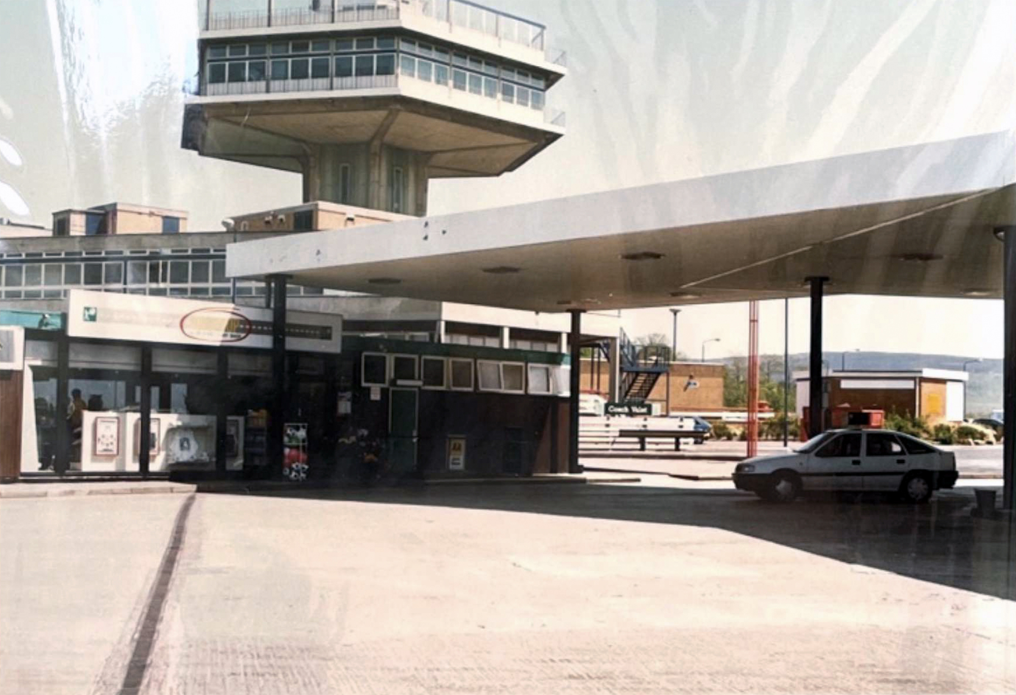 The forecourt at Forton northbound, with Rank branding on the shop.