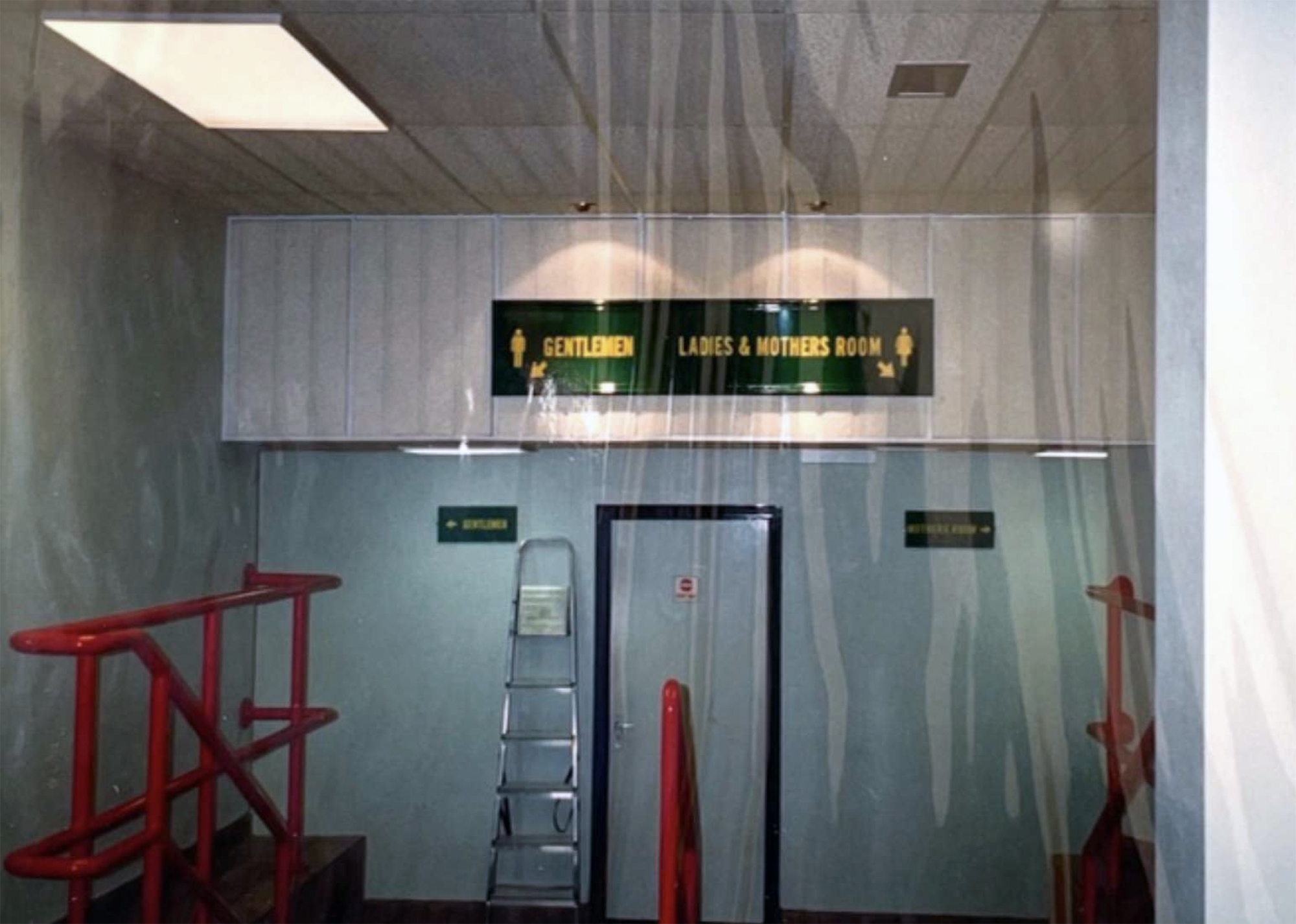 The stairs down to the southbound toilets in Pavilion colours. See also File:Forton amenity building 1965.jpg and File:Forton southbound staircase.jpg.