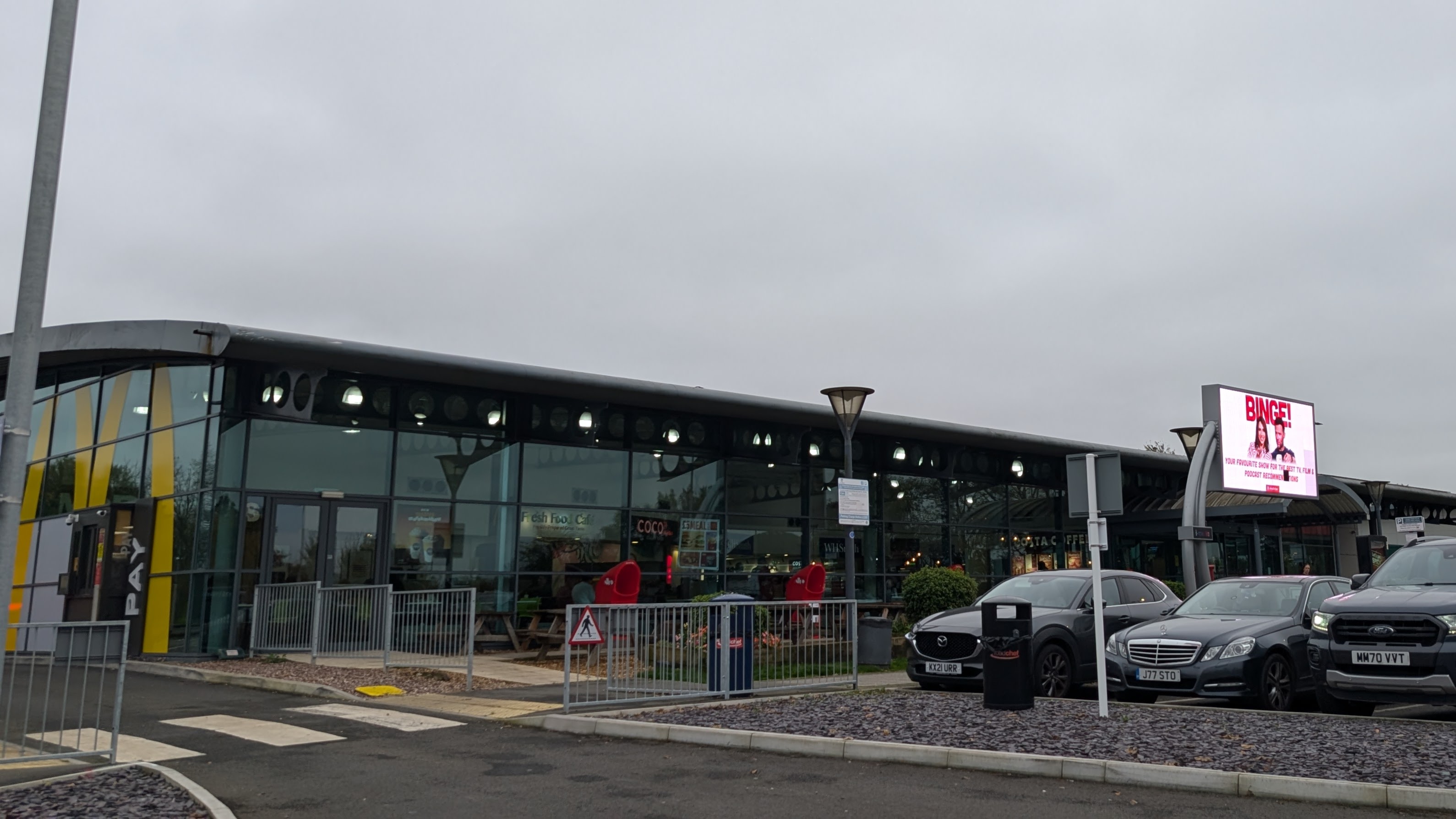 The front of the southbound services with a McDonalds drive thru lane at the left.