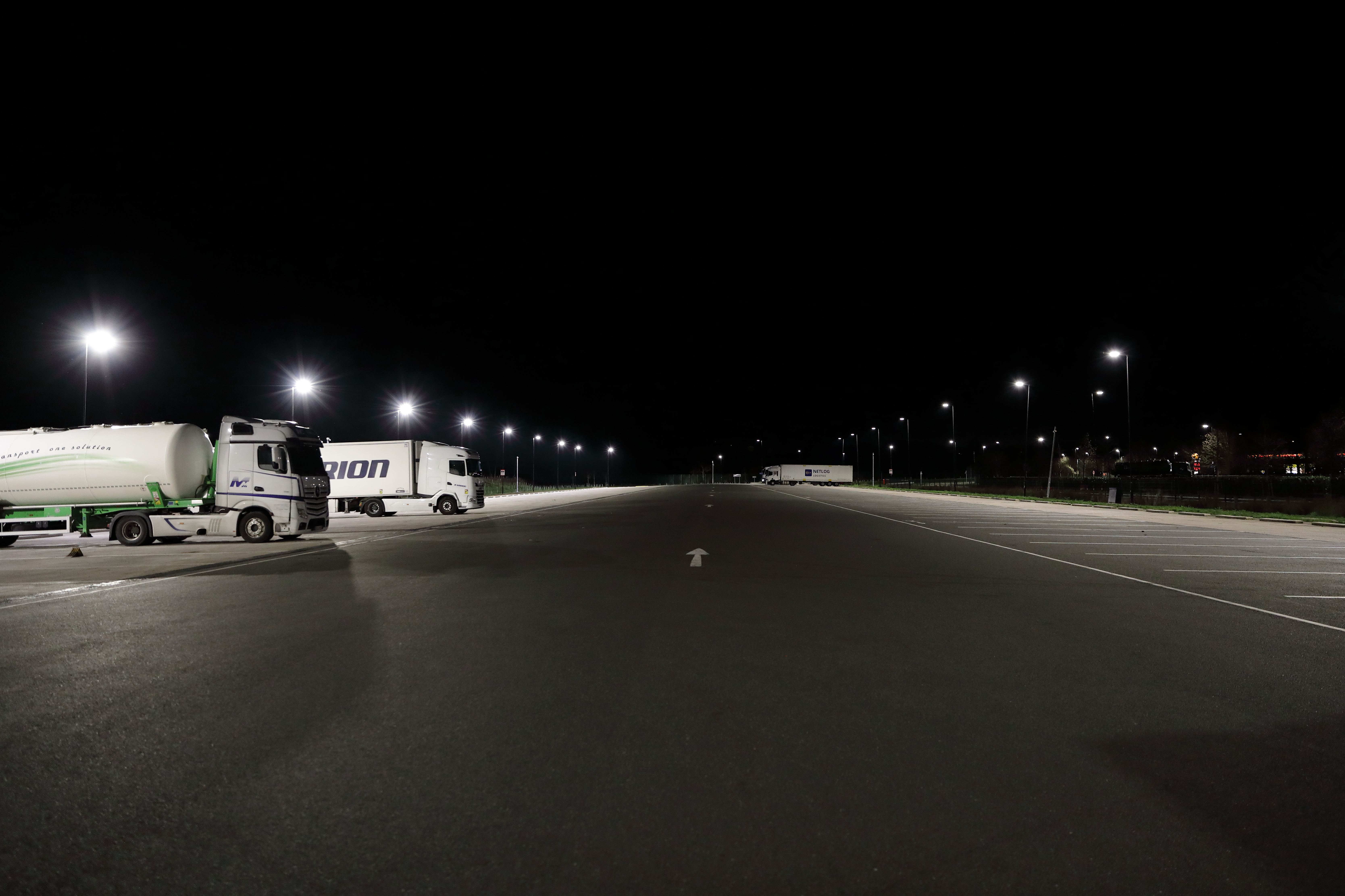 HGV parking at Peterborough services taken at Christmas time. The Shell filling station is visible in the background.