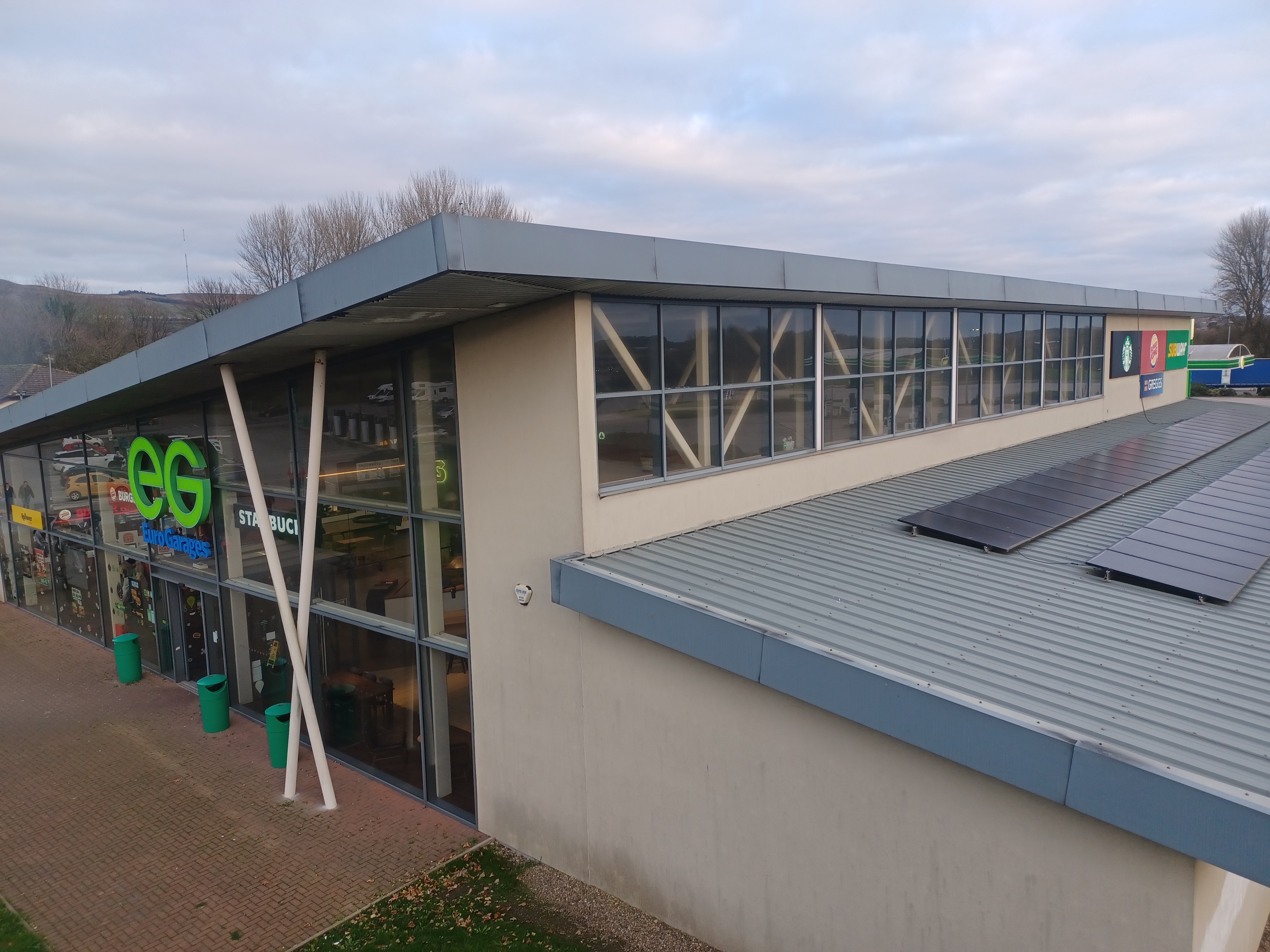View of the southbound building from the footbridge at Rivington services in November 2025.