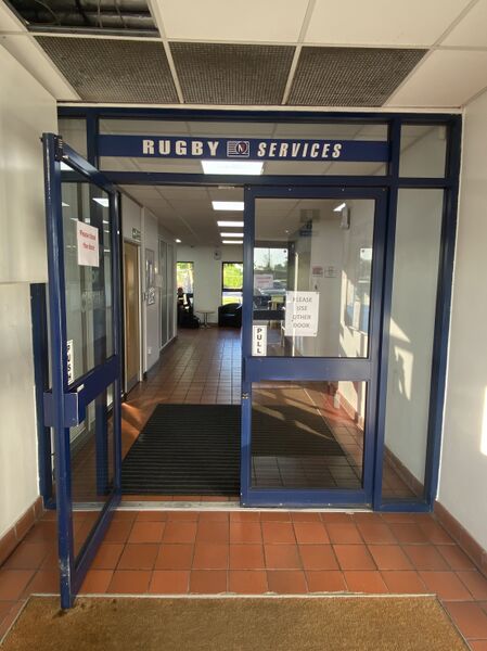 The interior entrance to Rugby Truckstop's amenity building, which features the 'Rugby Services' legend above the doors (not to be confused with Moto's own nearby 'Rugby Services').