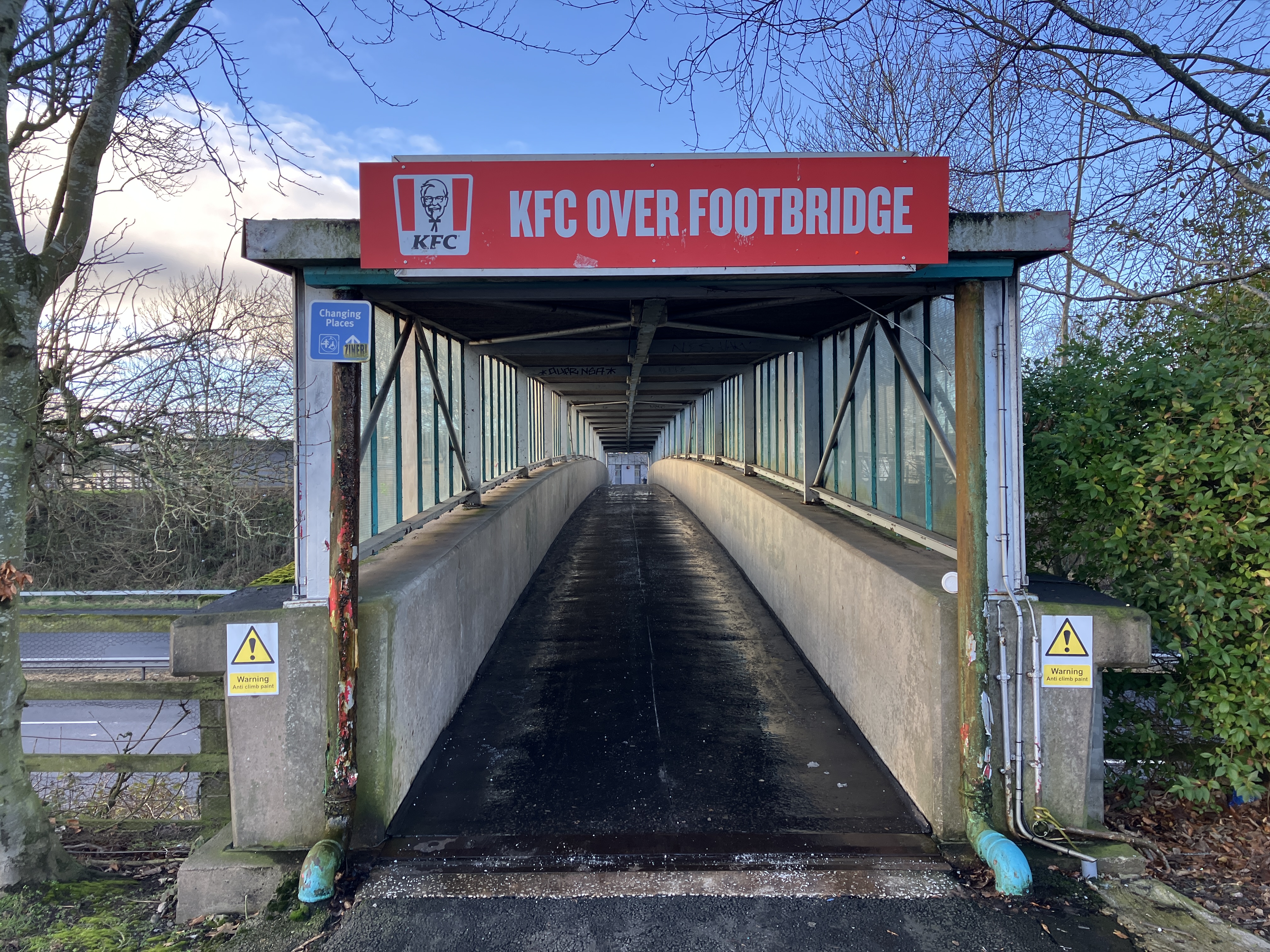 The footbridge between the two sides, now advertising the northbound KFC.