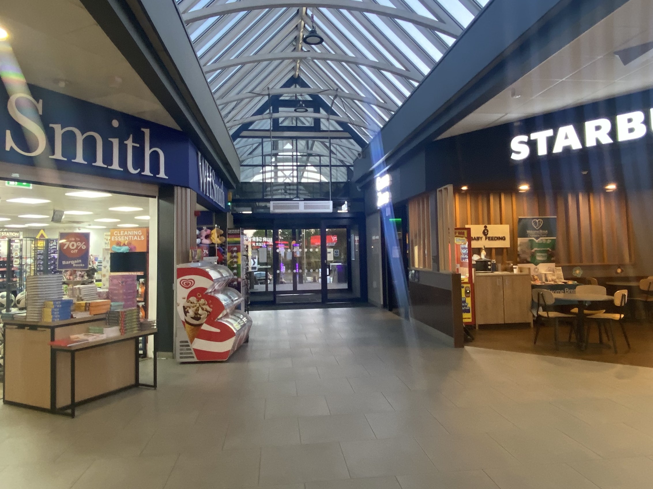 The interior exit to the northbound services' amenity building, which is sandwiched between the WHSmith store, the gaming room and the Starbucks outlet.