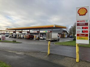 The forecourt was significantly expanded in 1992 with the Richardson family purchasing neighbouring land to add additional pumps and a new convenience store, built in an usual brick building. The site also rebranded to Shell at this point. It continued to be accessed from a small stub of road that was left over from its old route, but with an additional slip road to cut the corner.