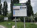 Sarn Park had all its signs put in this very strange style in 2016, with a distracting background.