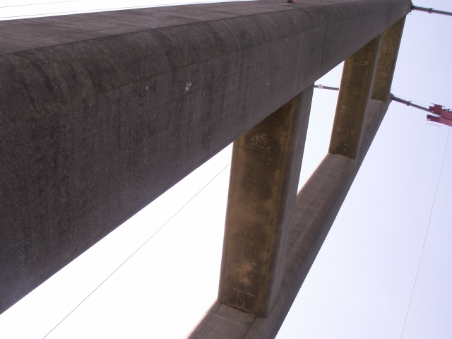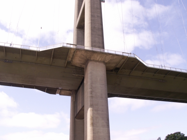 Looking up at the viewing platform where the north towers join the road deck, showing the structure of the bridge. Only from here do you really realise how big it is - impossible to get in one photo. It was built in 1981 having been planned in some sense since the '30s. Work started in 1972.