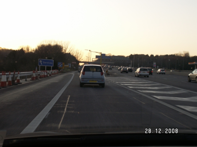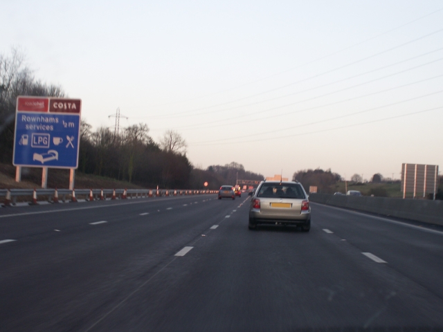 Another one-off, we'll pop in to Rownhams services for a quick visit. Notice the sign on the left because there isn't enough space next to the newly-widened carriageway. Why give us the phone number for the roadworks when we're about to go back through them?
