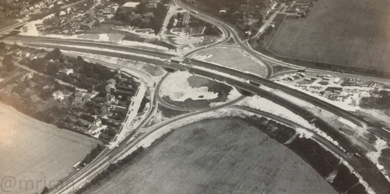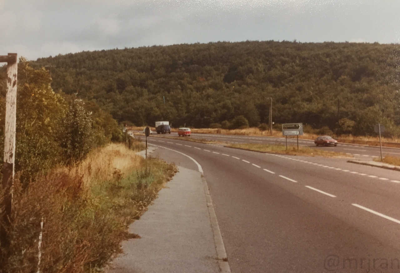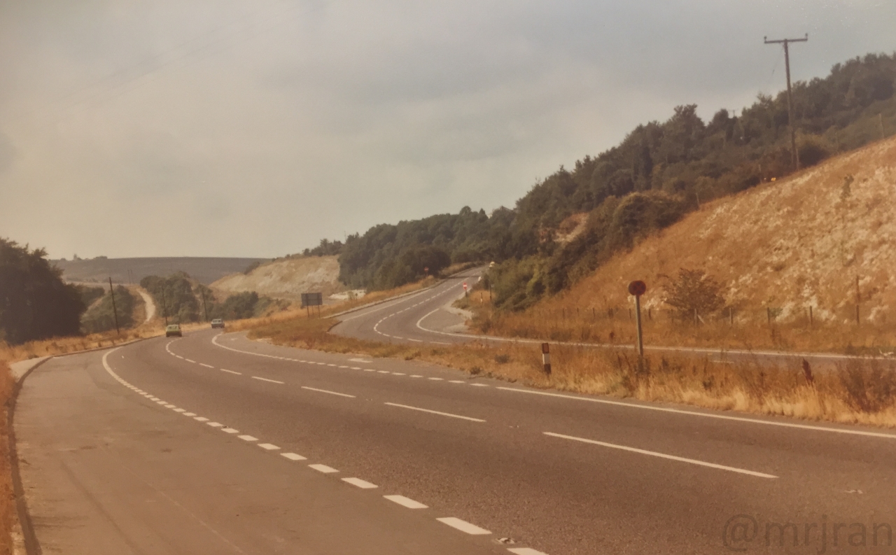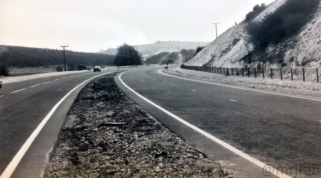 Looking south at the same junction as the previous photo. You can just about see the southbound carriageway (left) snakes off to the left on a new alignment (the hill is still bare where it has been dug), while the northbound carriageway (right) takes an older route. A new northbound side was provided later in the 1980s and the road on the right is now the old London Road, serving all the properties along the way. The Gravel Hill café would have been just out of shot on the right.