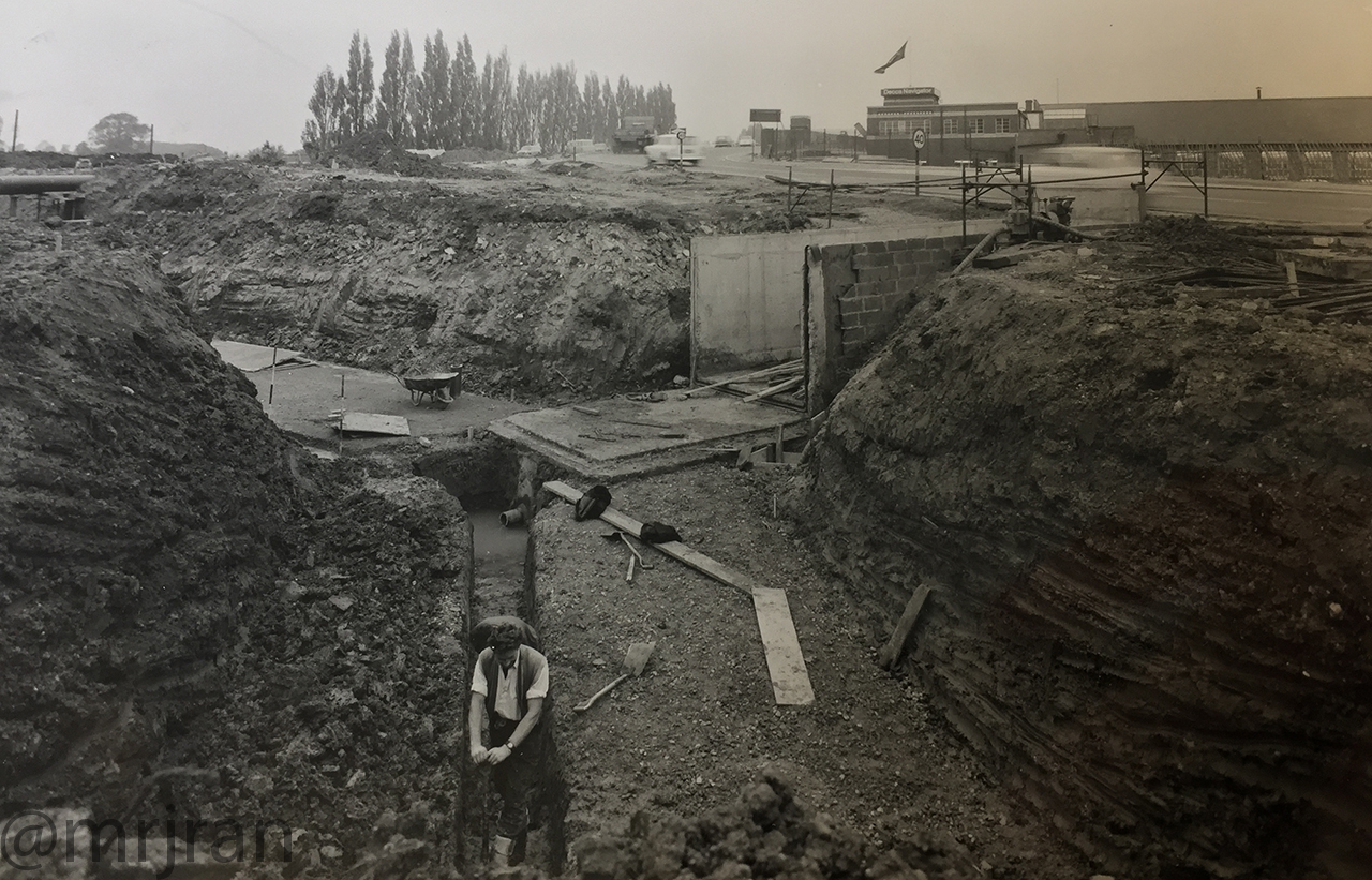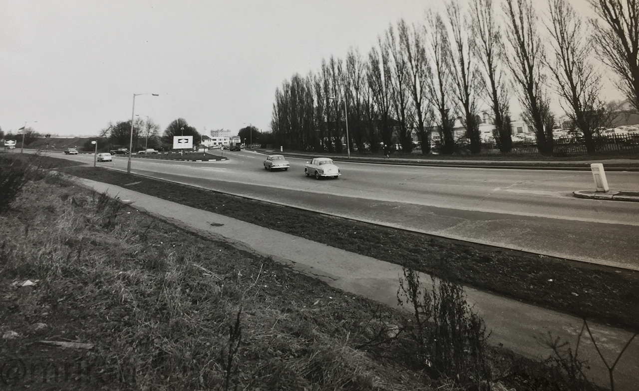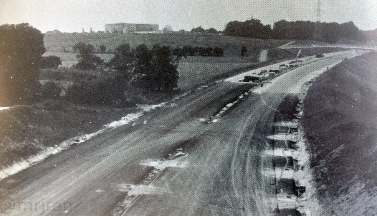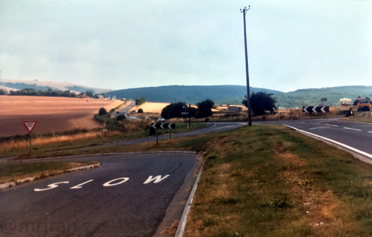 Looking south at the same junction as the previous photo. You can just about see the southbound carriageway (left) snakes off to the left on a new alignment (the hill is still bare where it has been dug), while the northbound carriageway (right) takes an older route. A new northbound side was provided later in the 1980s and the road on the right is now the old London Road, serving all the properties along the way. The Gravel Hill café would have been just out of shot on the right.