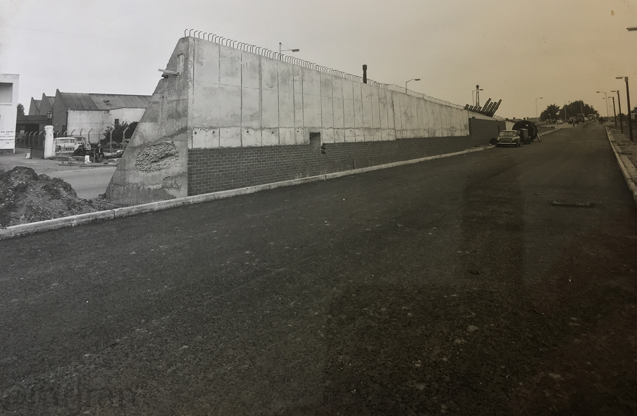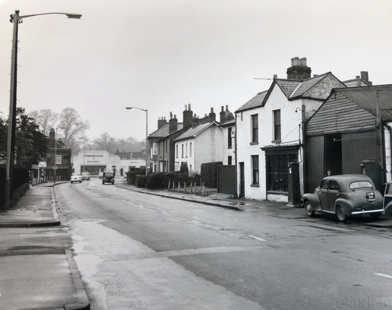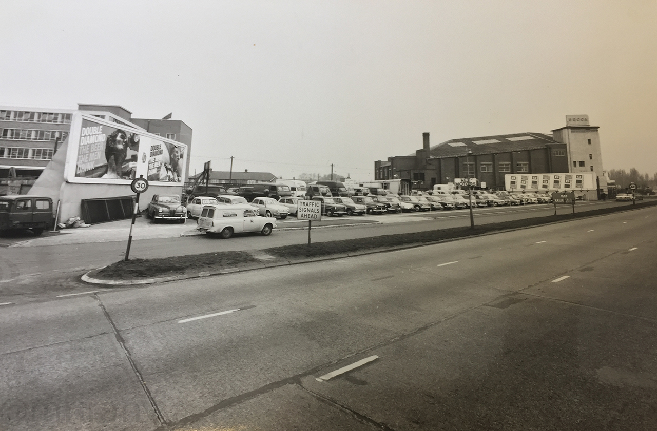 Looking north along the Kingston Bypass in 1965. Meeten's Motor Mecca is in the distance. The road has a concrete carriageway and a narrow local access path.