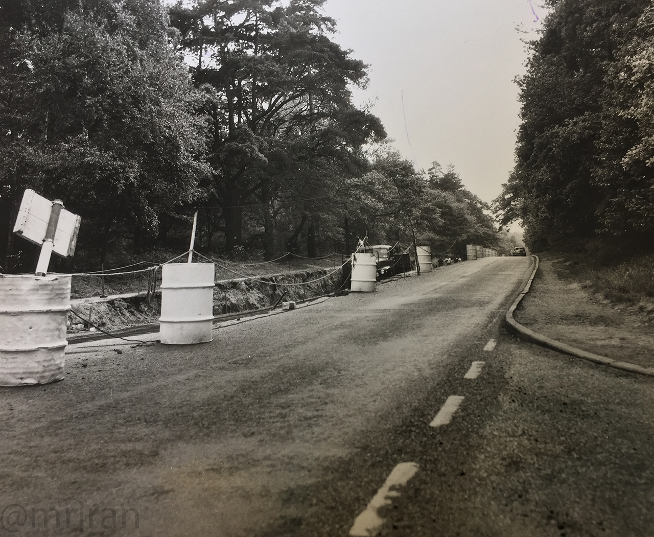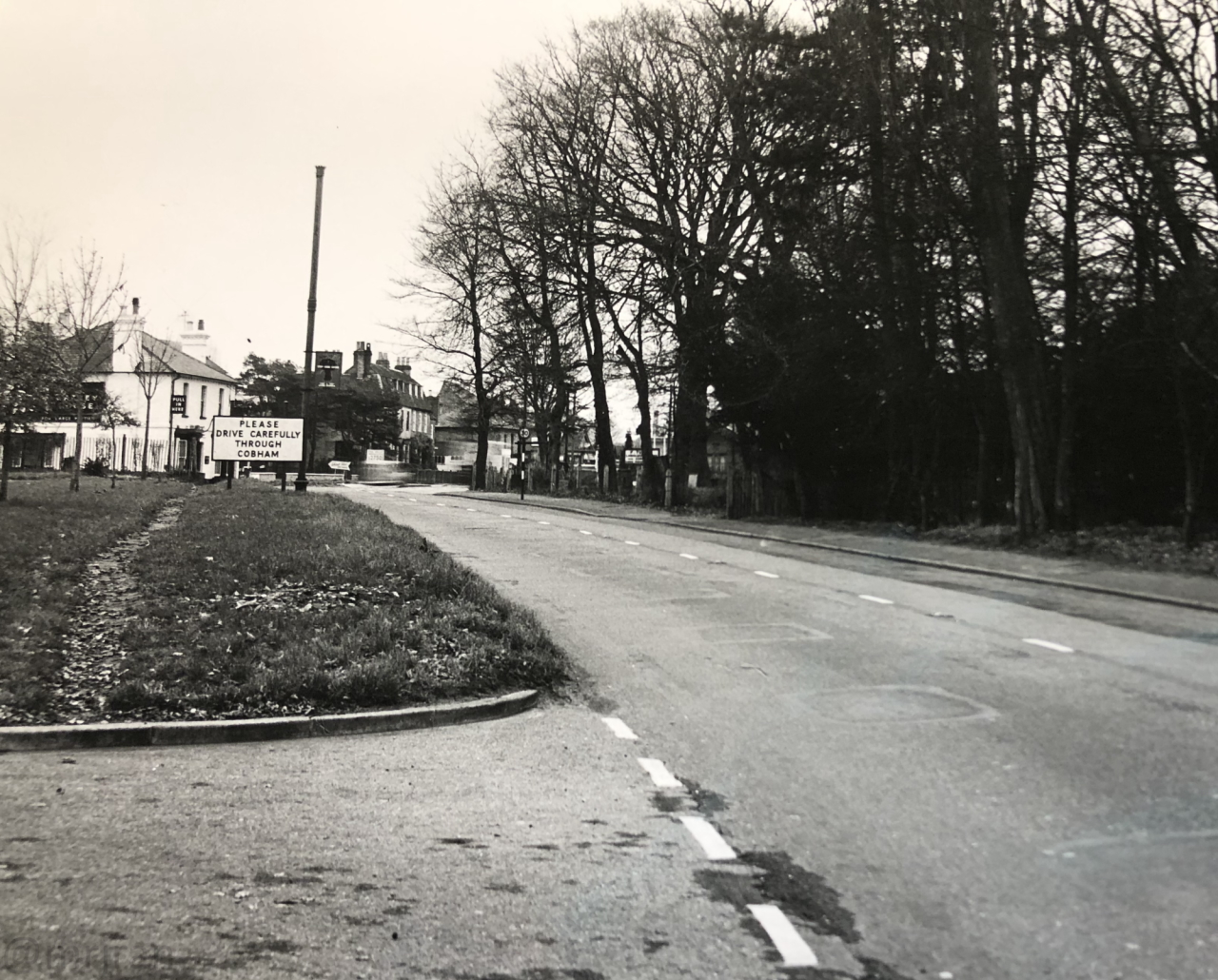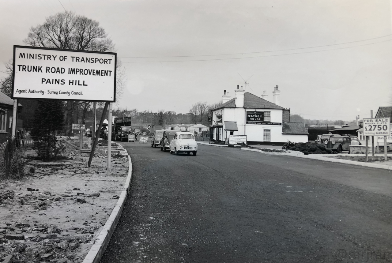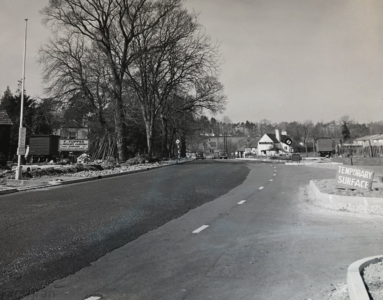 Looking west out of Cobham again, with a Ministry of Transport sign explaining the roadworks on Pains Hill. Traffic appears to be giving way to the roadworks.