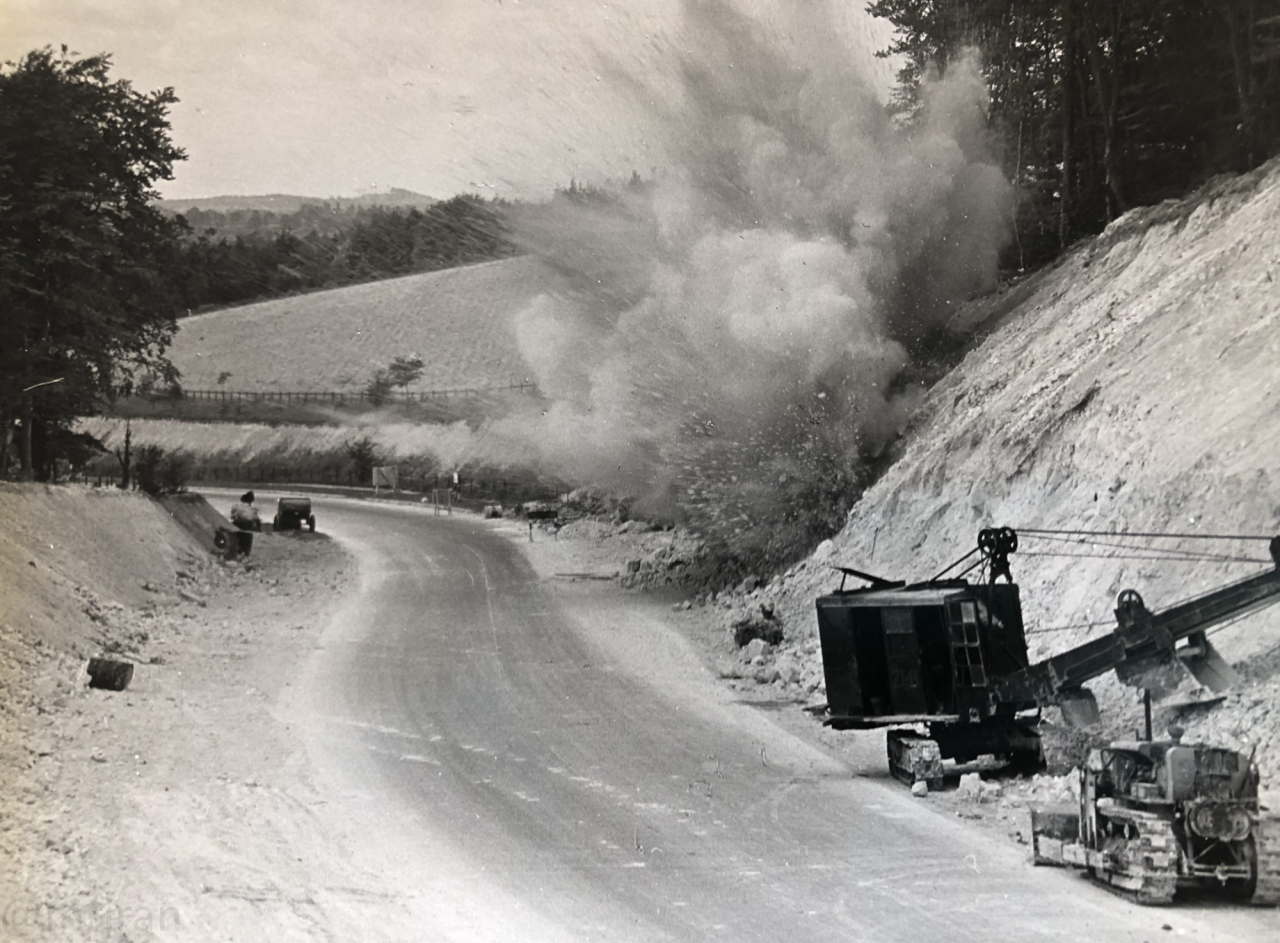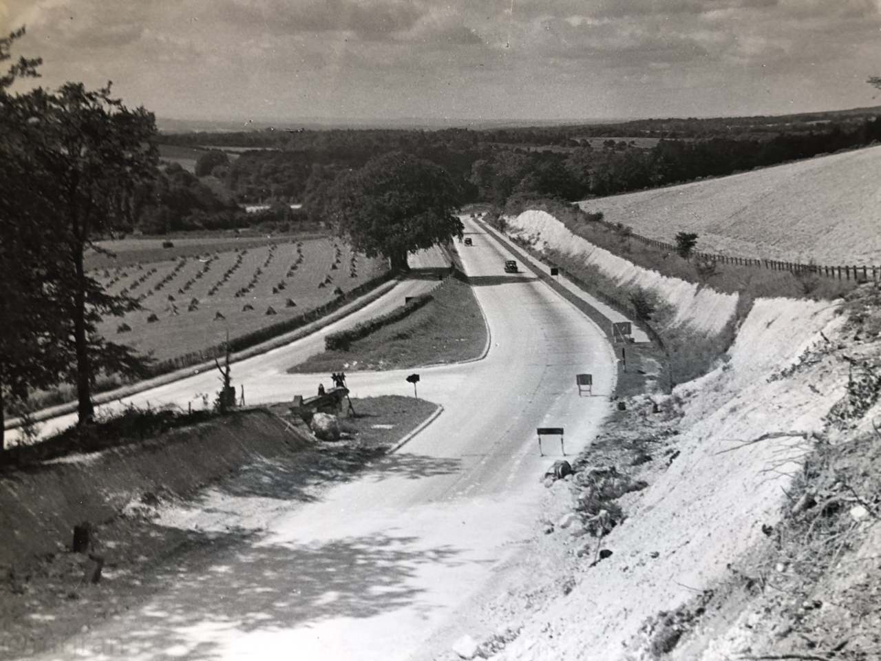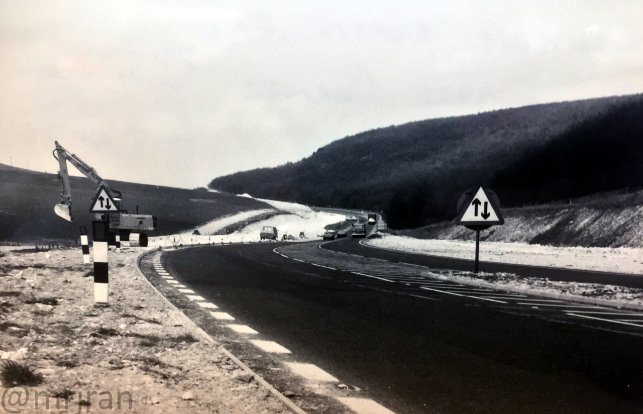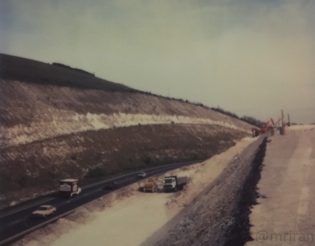 The upgrade in progress: replacing the notorious Cannonball Corner with a smooth, flat dual carriageway known as the Butser Cut. A new northbound carriageway has been built on the left, now the old road over the hill is being torn up, to make space for a new southbound carriageway. Likely taken in 1976.