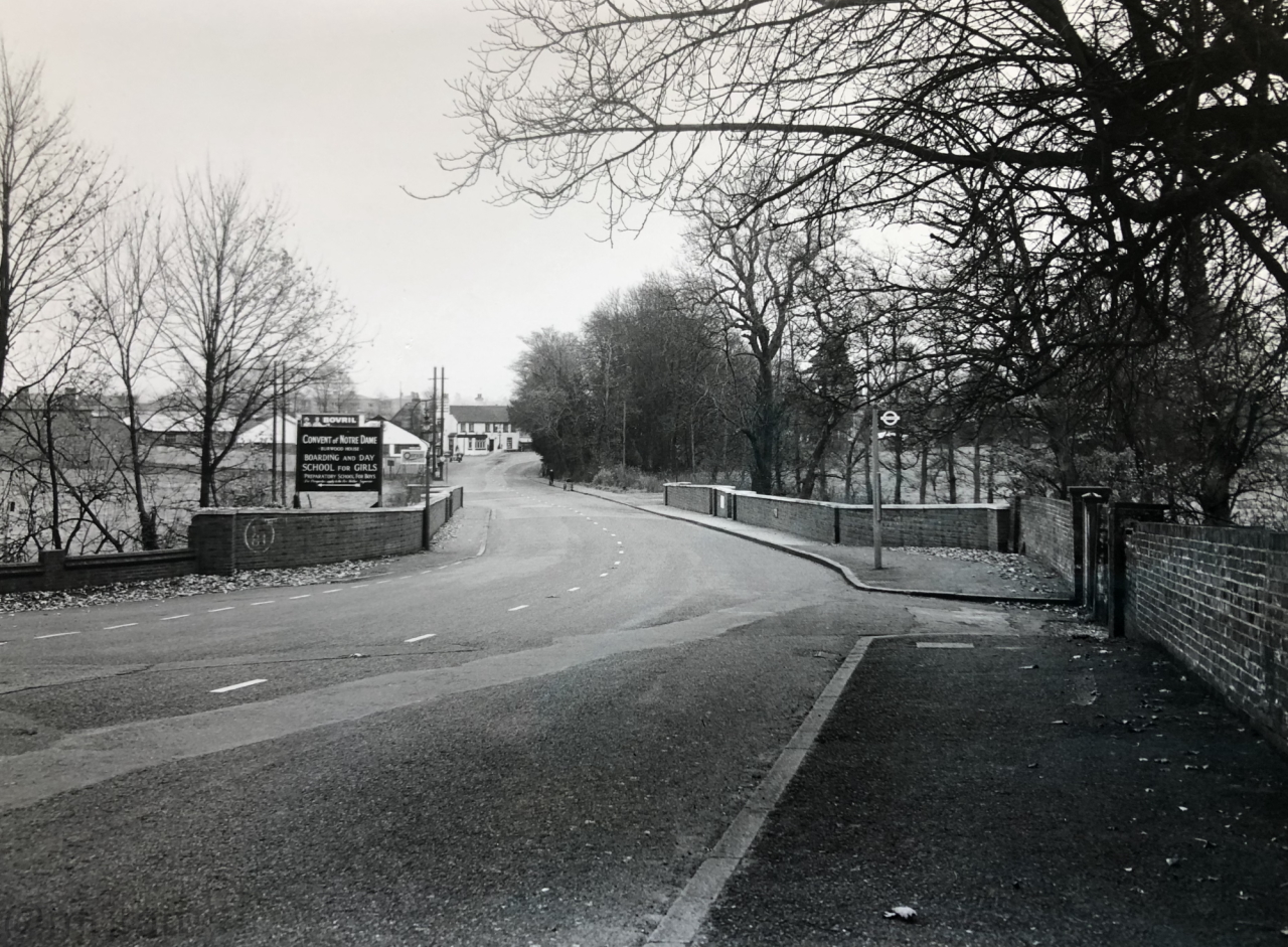 Looking east over Mole Bridge, into Cobham, with Pains Hill behind us. The sign advertises Notre Dame School.