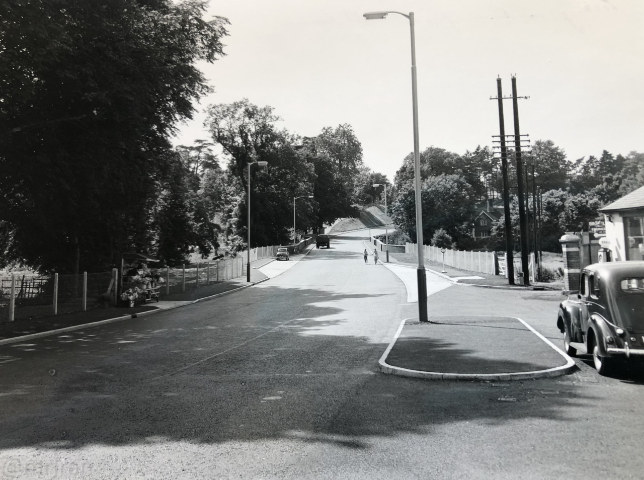 Looking west across Mole Bridge, out of Cobham towards Pains Hill. This is 1958, and realignment works have been taking place.