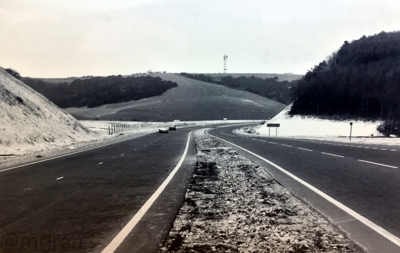Looking north along the brand new dual carriageway, in between the exits for Queen Elizabeth Country Park. Likely to be dated 1982.