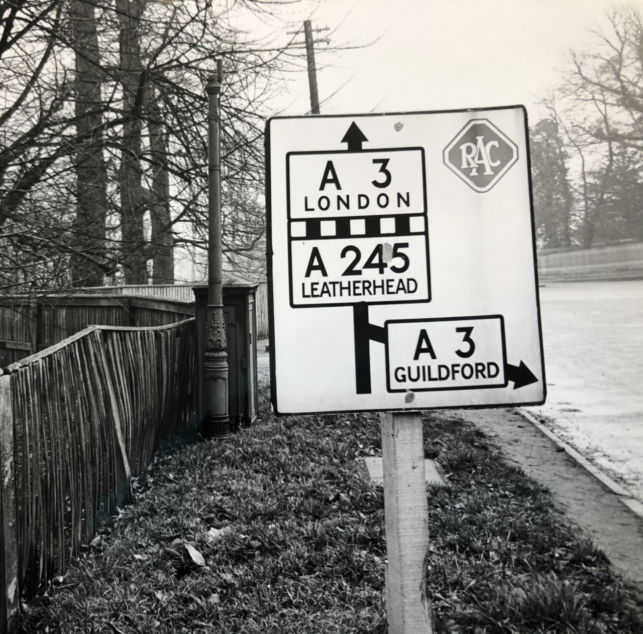 Looking south at the junction of the A3 and the A247 in Send in 1955, with a pre-Worboys road sign. A three-lane ("suicide lane") section appears to be coming to an end.
