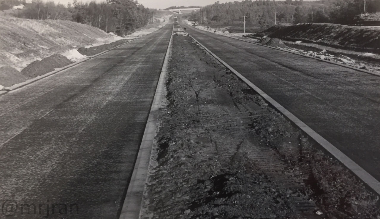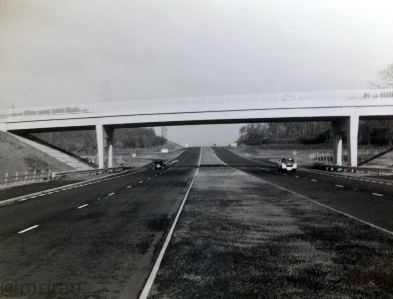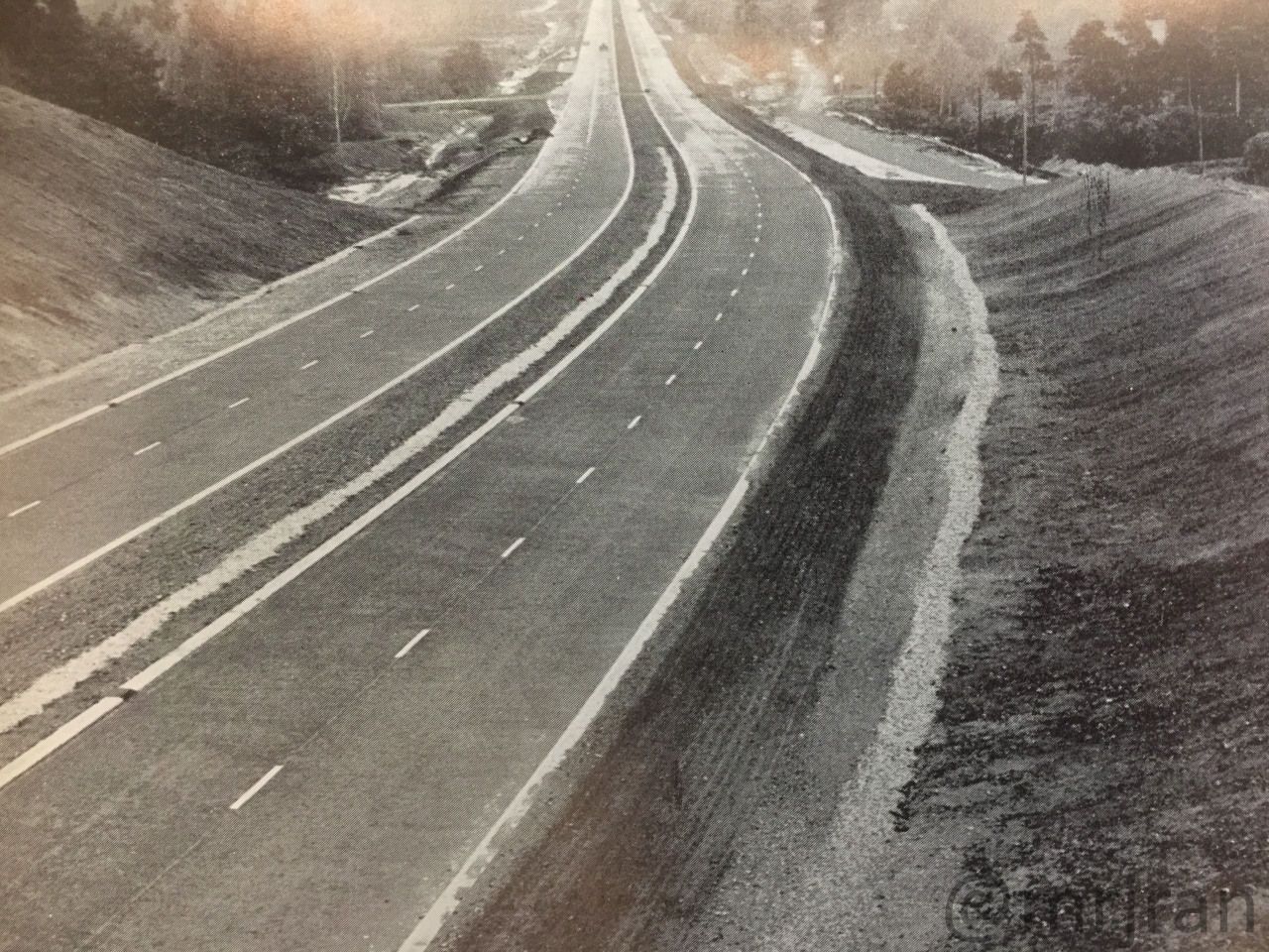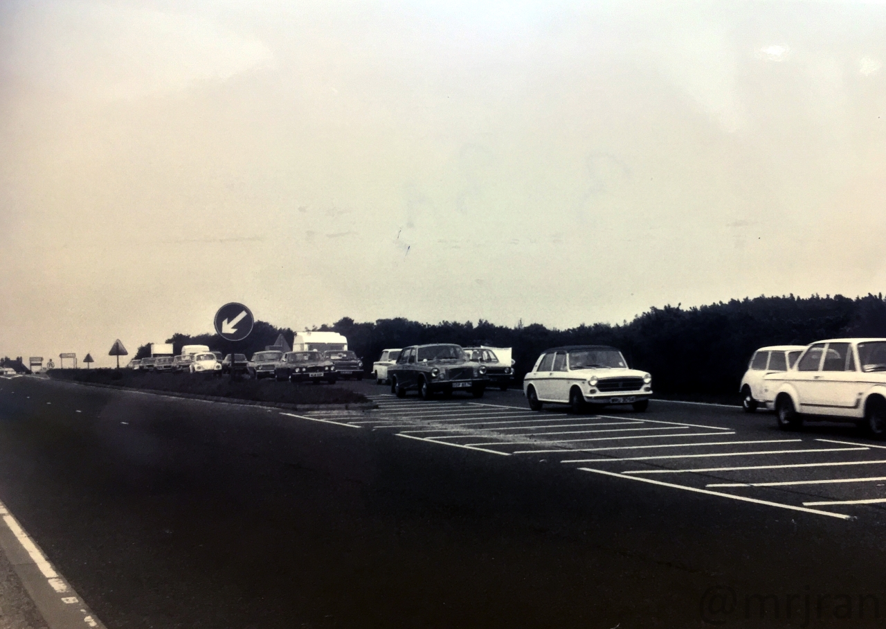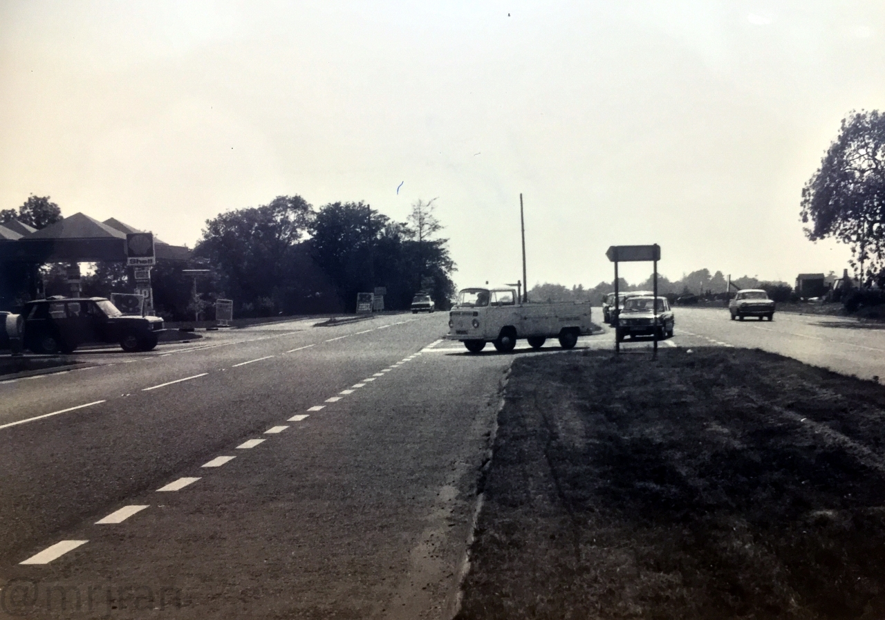 Looking west at Picket Post, as a vehicle tries to turn right by the services before the underpass was built (1977).