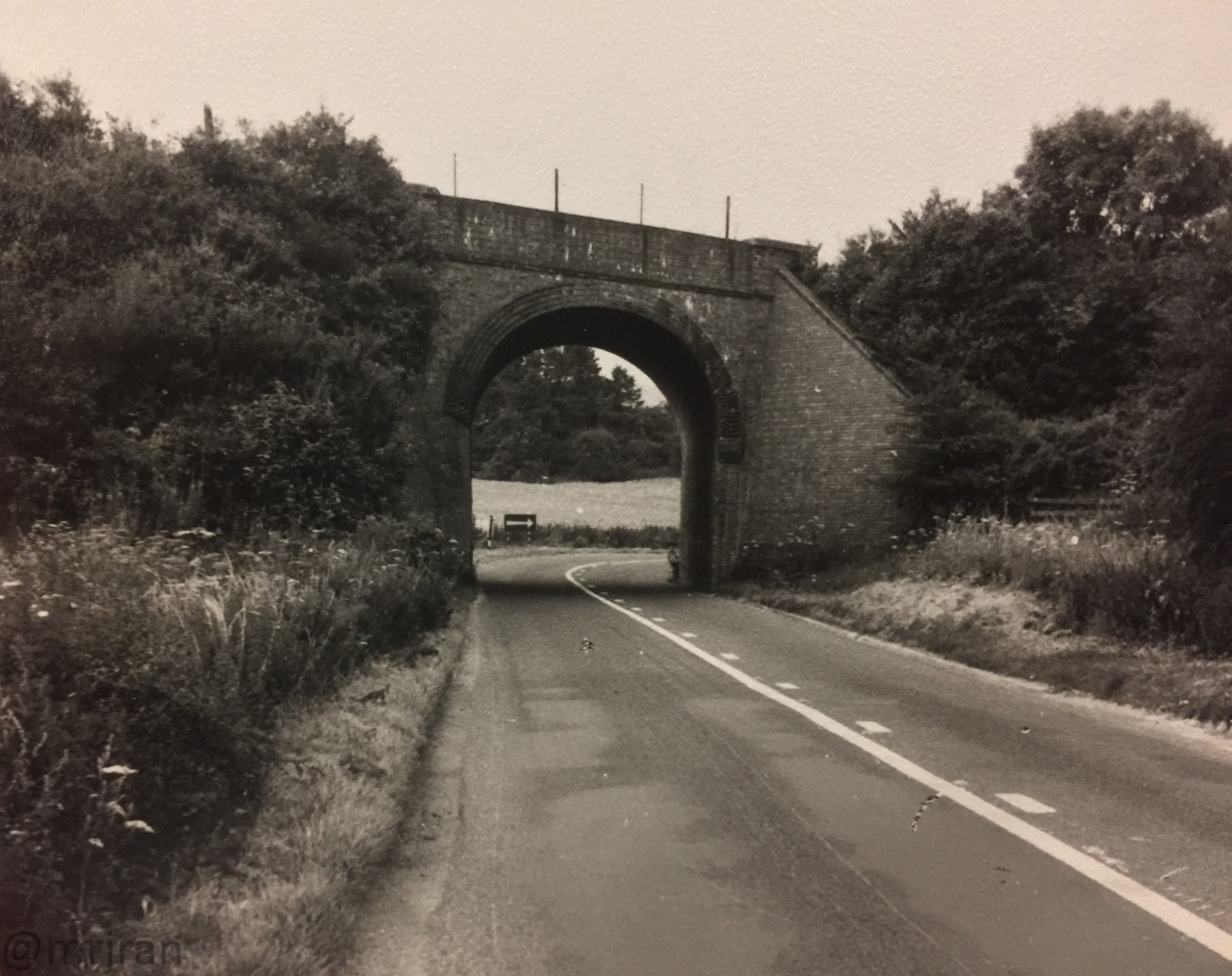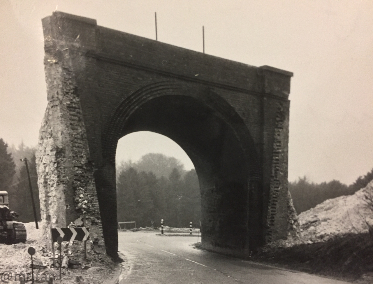 A dual carriageway with bollards forms to highlight the bend as the road goes under the arch. The sign at the end says "keep left".