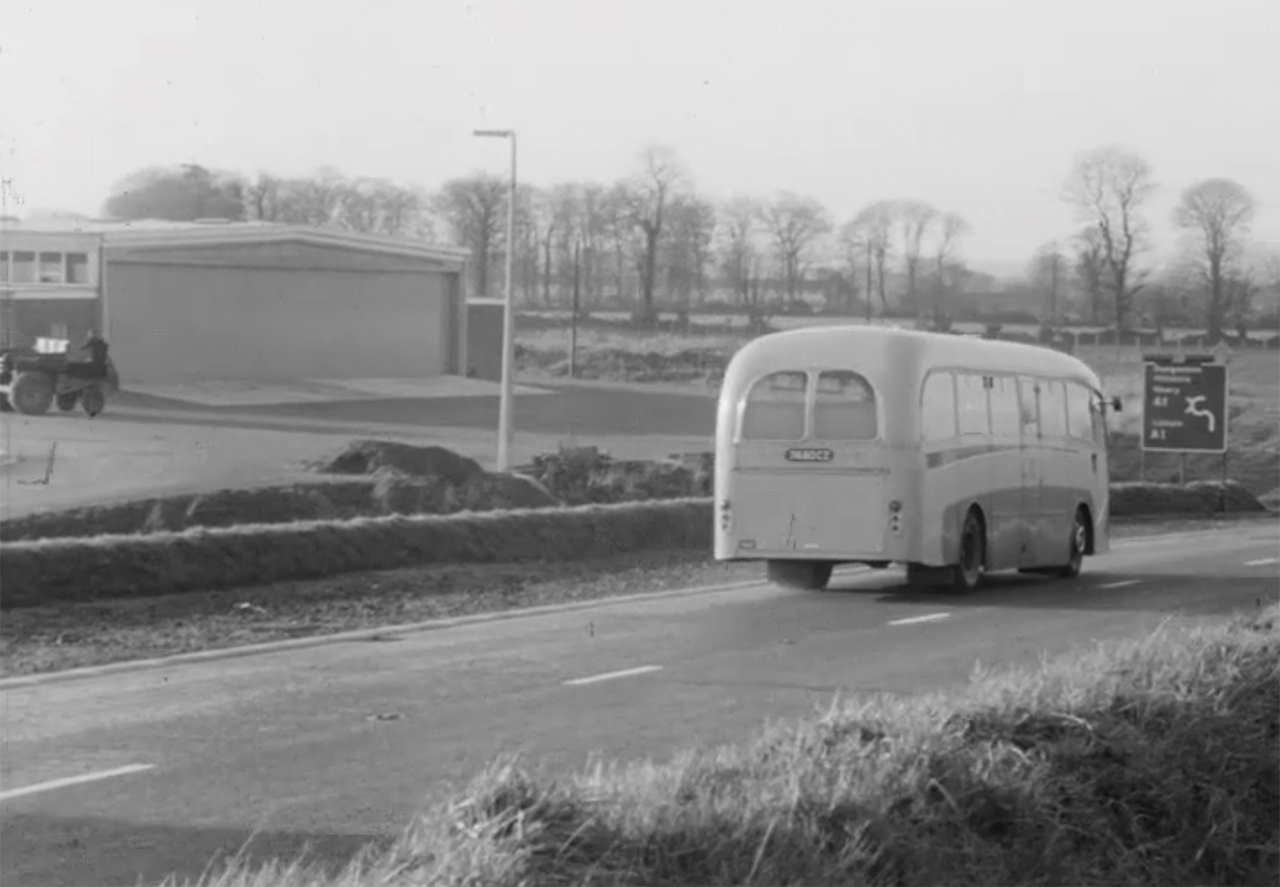 A bus taking the exit at M1 J7 in 1963. The old-style road sign in the background offers directions to Lisburn and Newry, and again Dublin is ignored.