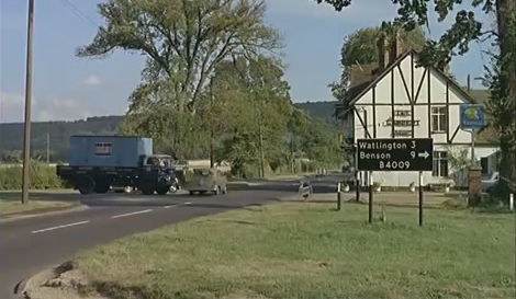 The A40 meeting the B4009 in 1965, with some dark road signs. The B4009 was later diverted to meet the M40 at Lewknor, but the pub (the Lambert Arms) is still there today.