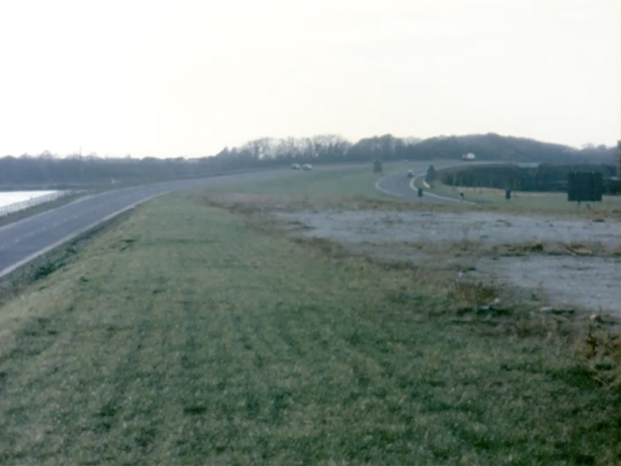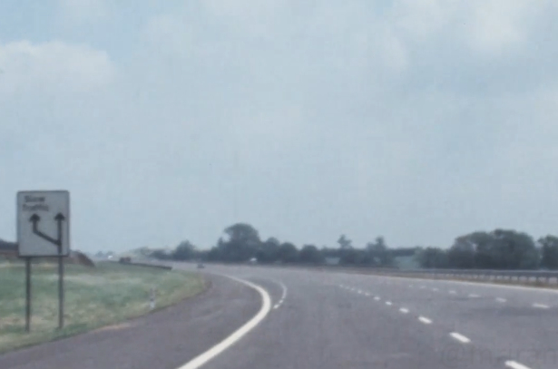The exit from the M1 northbound at J29, in 1971. On the right is a gap in the new central barrier, as was common at the time.