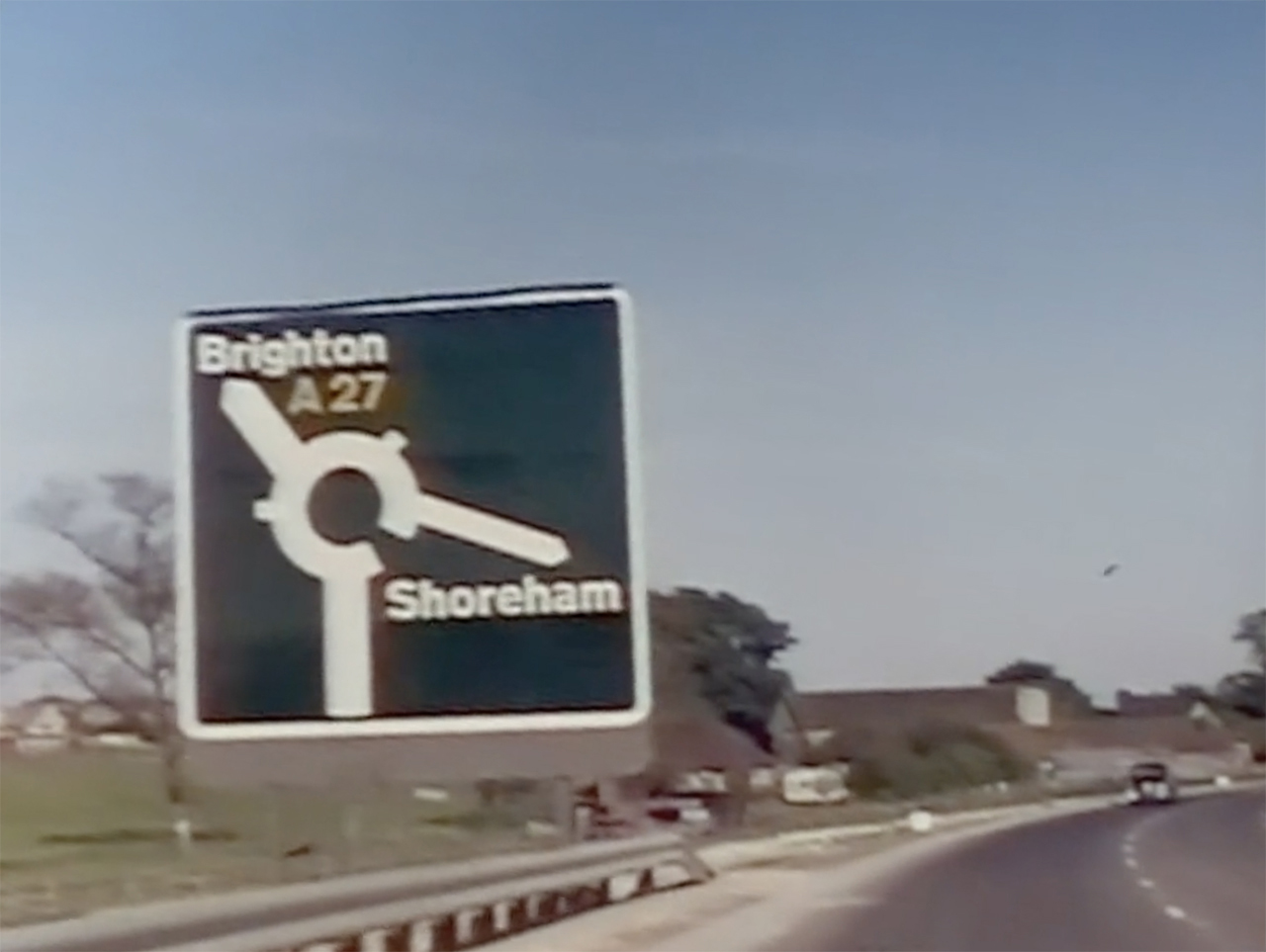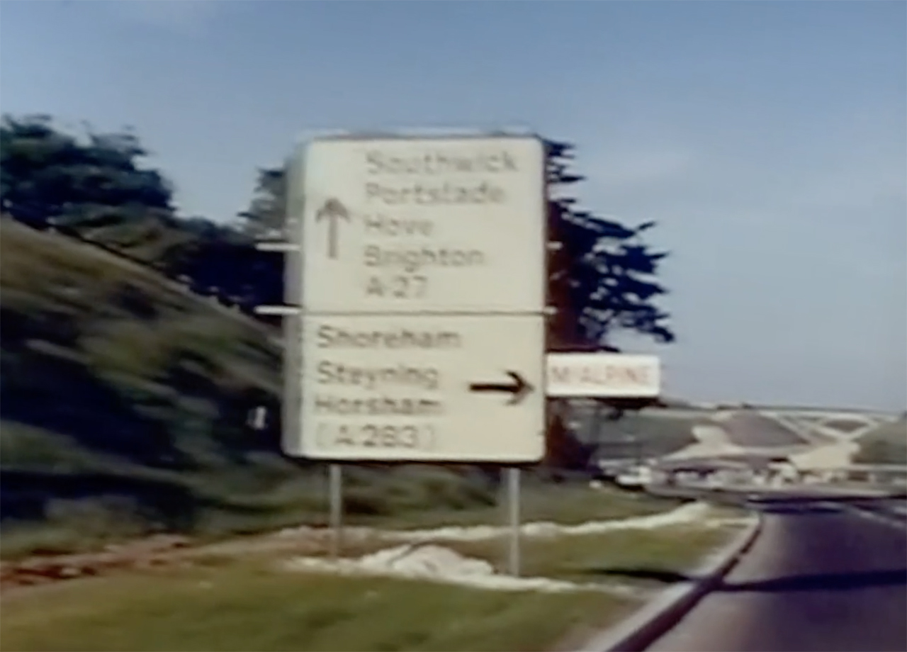 Further east, approaching Sussex Pad. The sign says: "Southwick, Portslade, Hove, Brighton, A27; Shoreham, Steyning, Horsham, (A283)". This is probably a temporary sign as the new Shoreham Bypass was open at the time, but the new exit for the A283 was still closed. Contractor's signs relating to the construction of the Adur Bridge are just visible behind it.