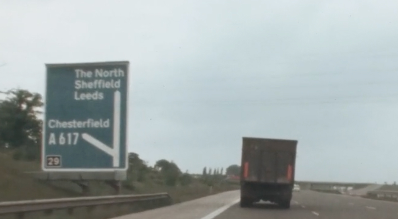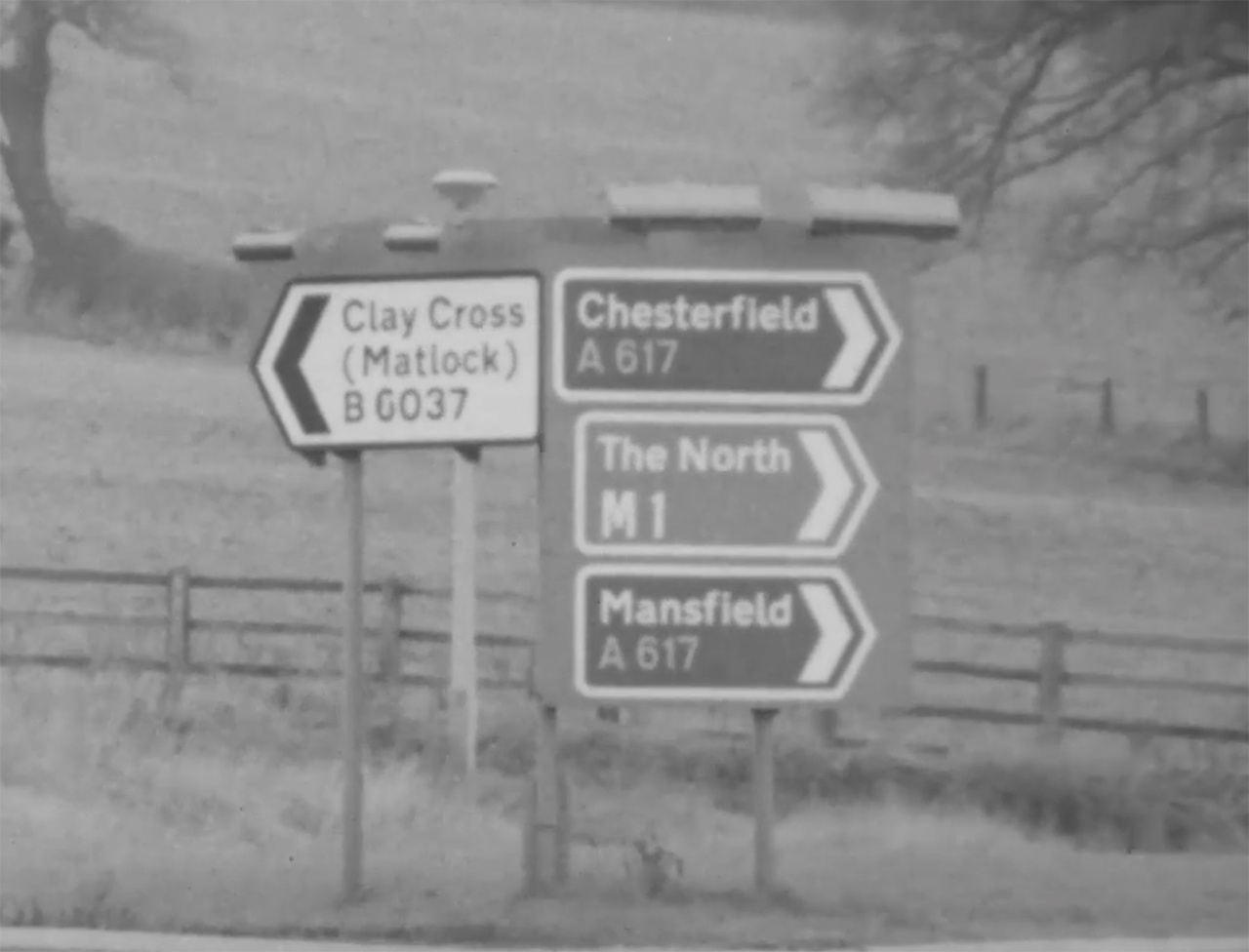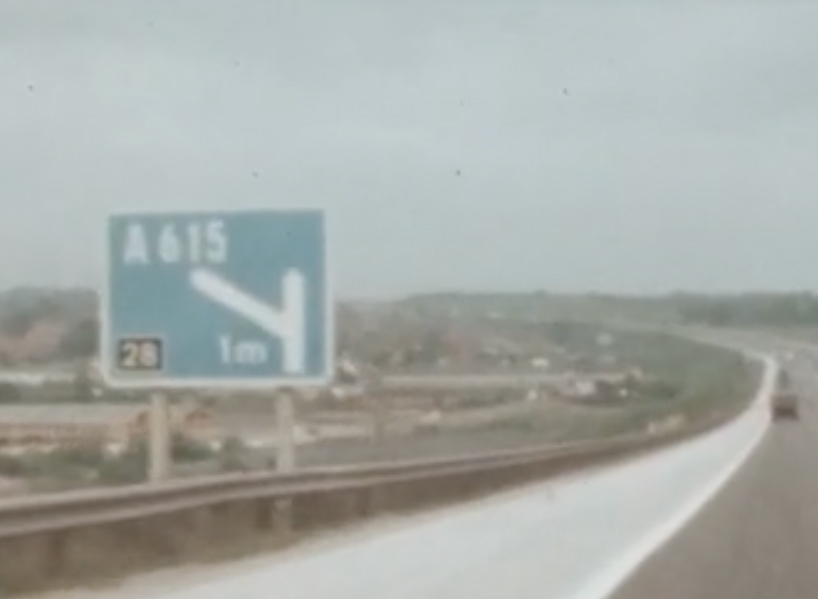 The fork sign for the M1 at J28, when little information was provided on the 1 mile signs. The A615 is now the A38 at this junction.