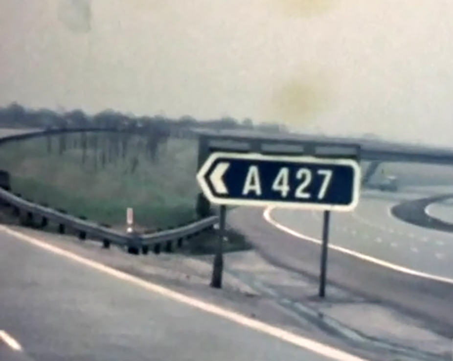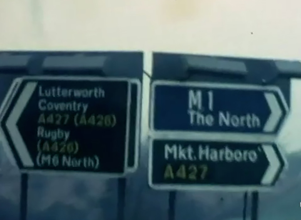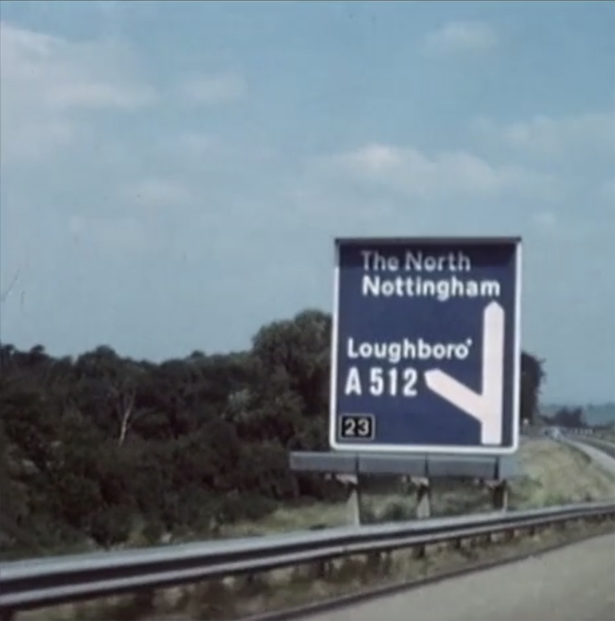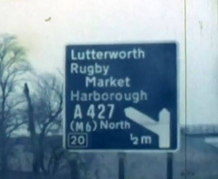 On the M1 southbound at J20 in 1972. All of the signs have had "(M6) north" crudely added to them following the opening of the M6 at J19, with the M69 not yet built. The A427 is now the A4304.