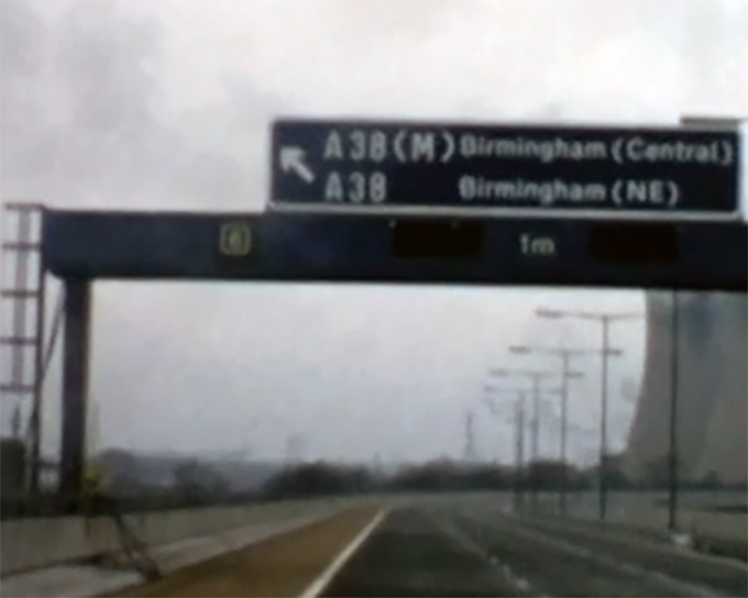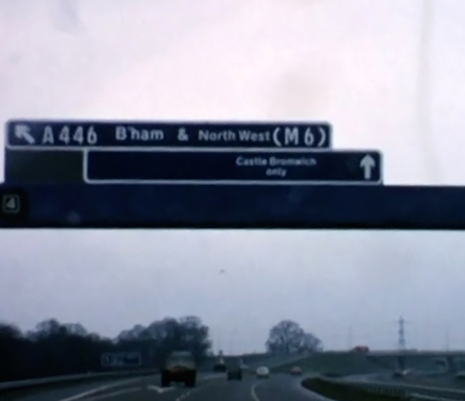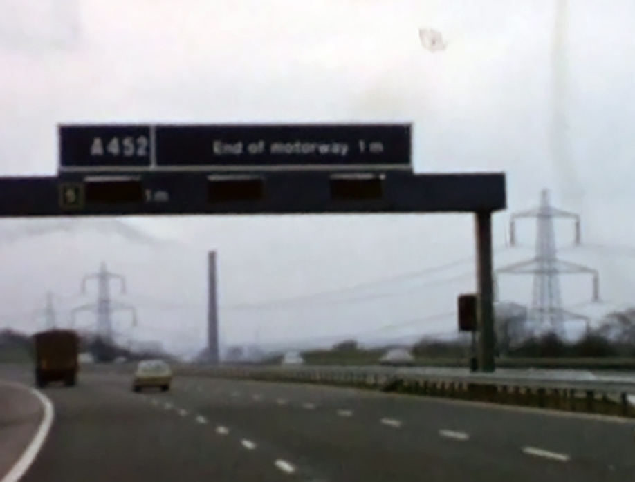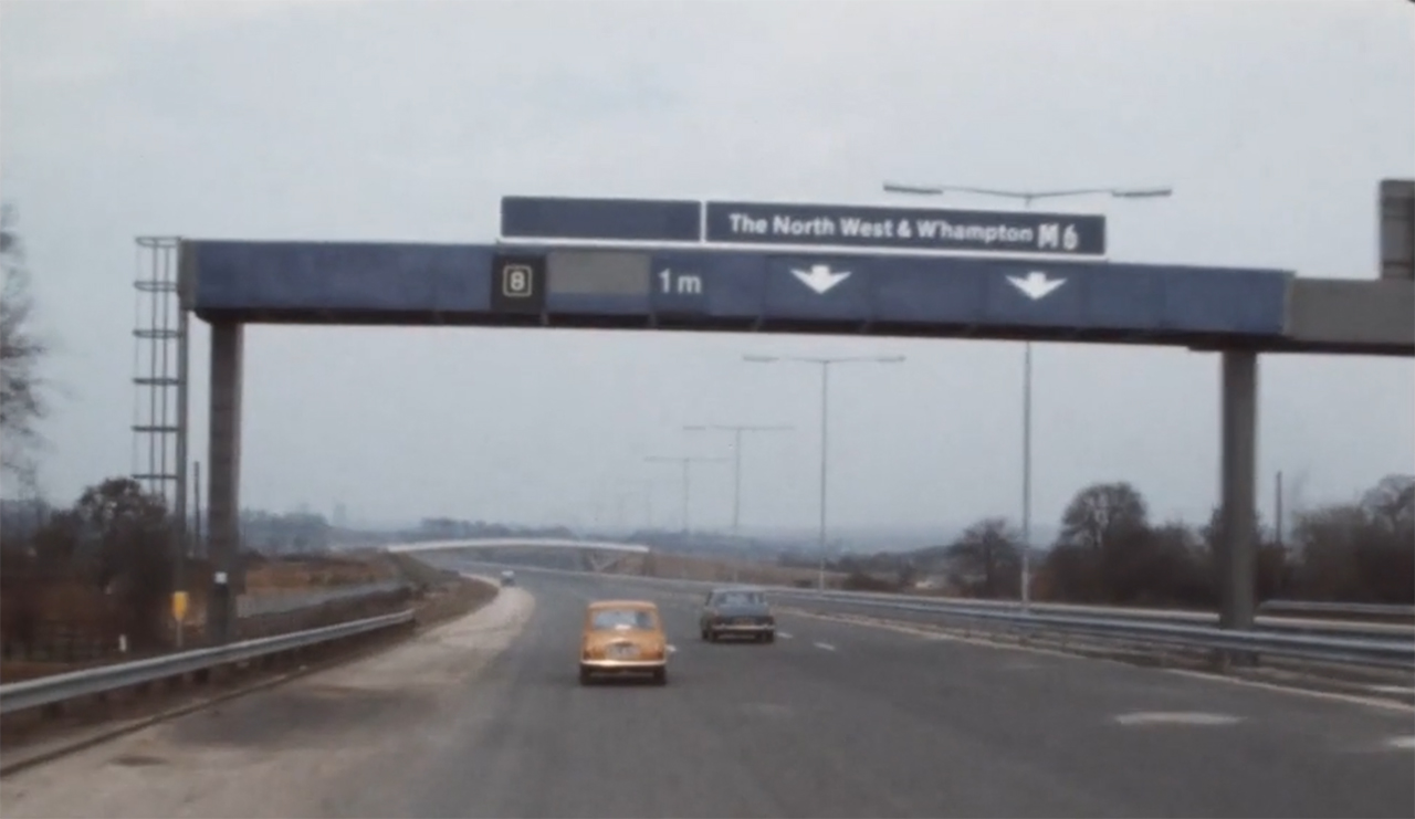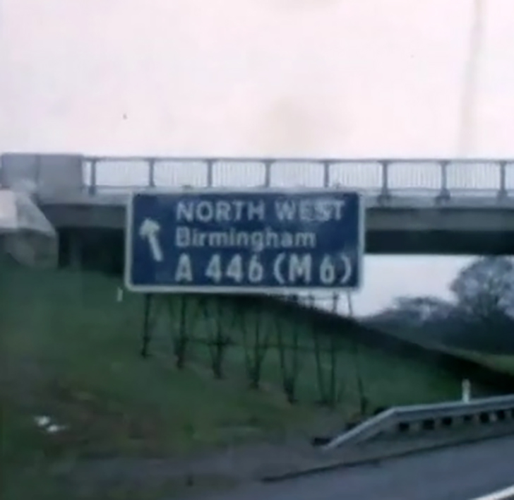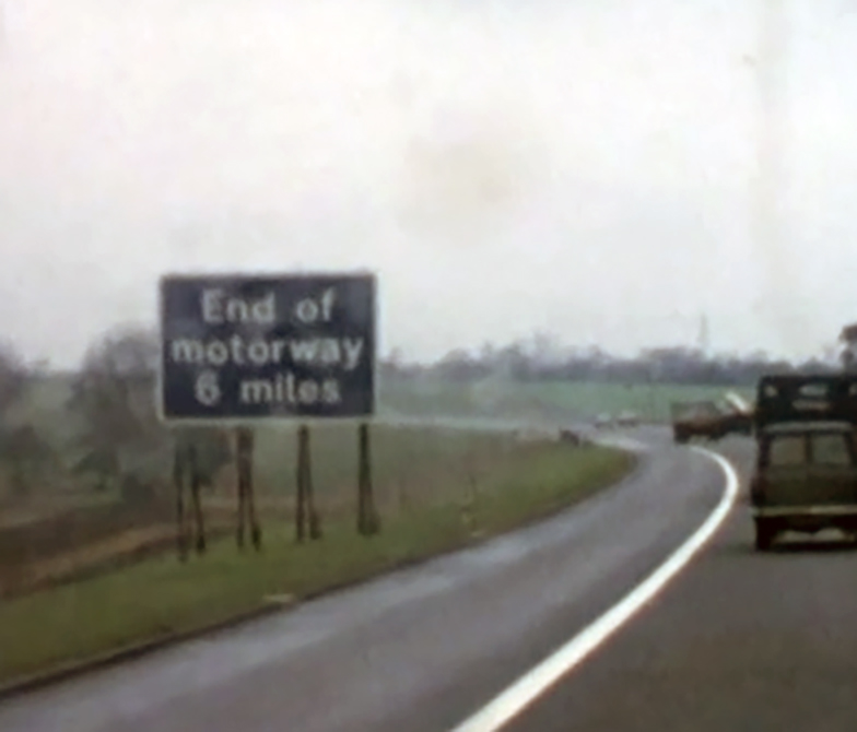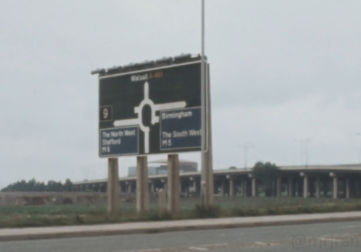 The sign for M6 J9 in 1971. To the right 'London' has been covered up as the M6 isn't finished. For the road it says 'M5', as that end of the M6 led straight onto the M5.