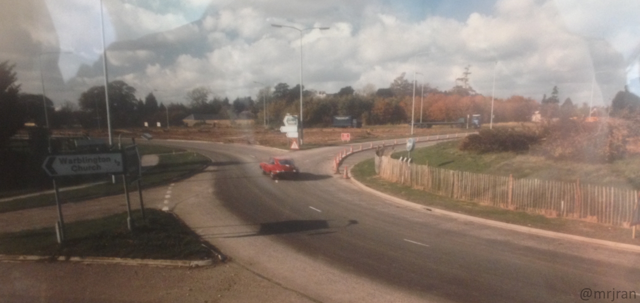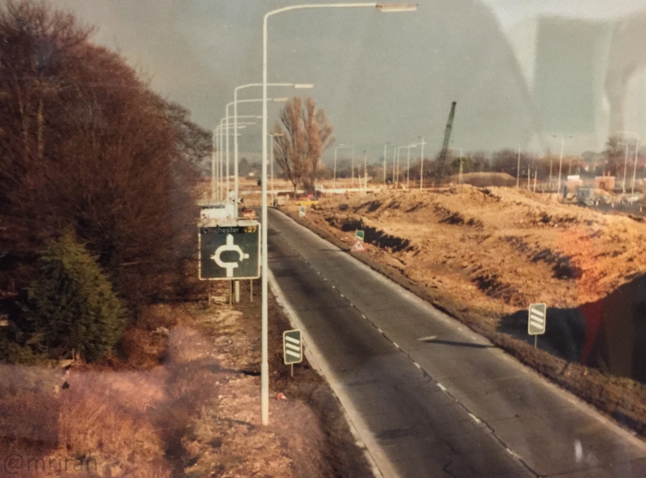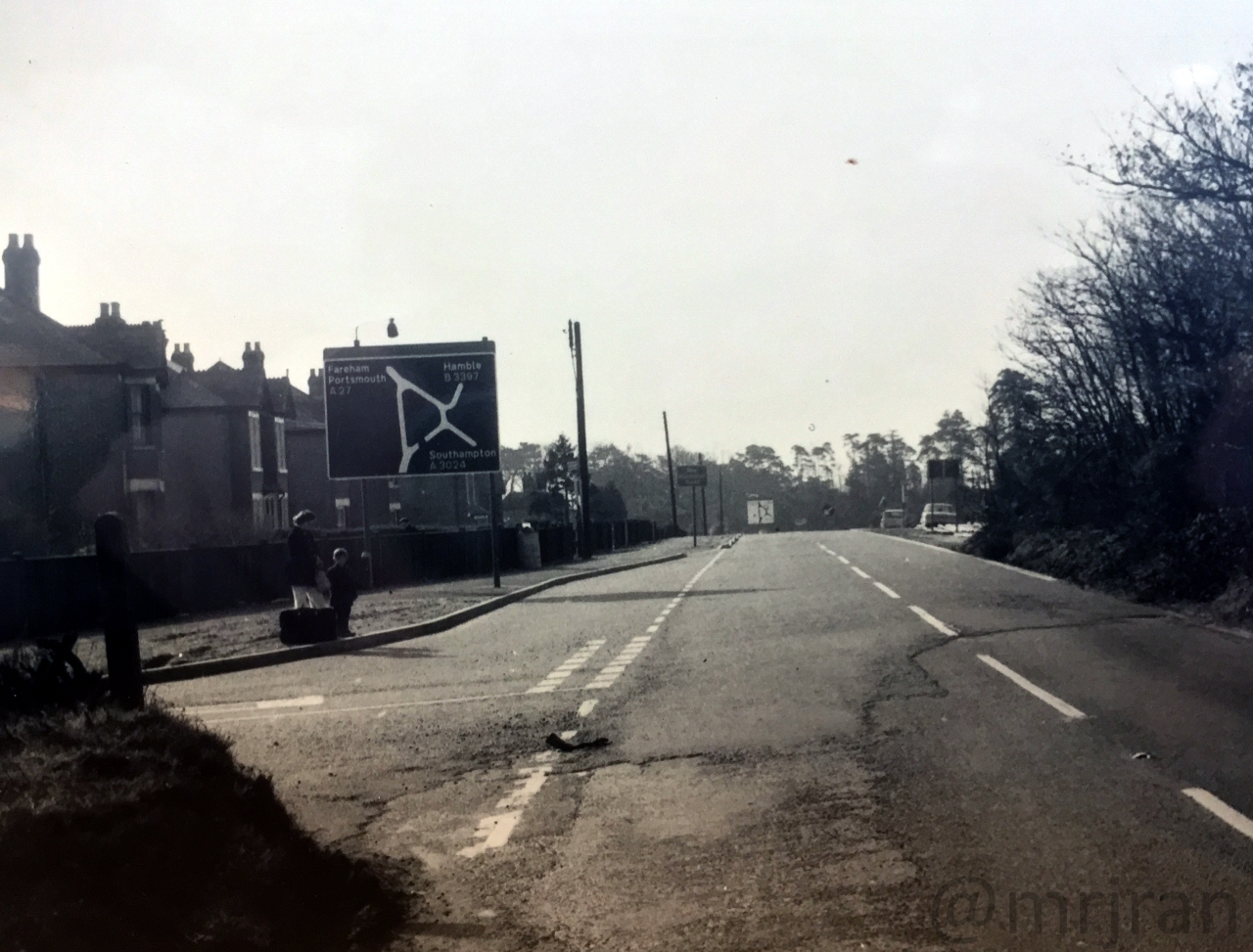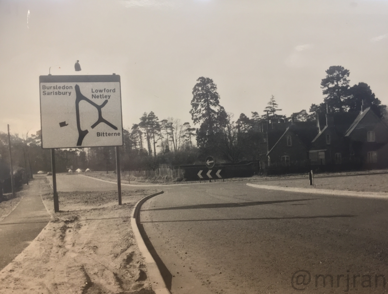 The sign for the roundabout includes the route of an extension to meet the M27 (Bert Betts Way), badly covered up. On the right is The Lodge, which was later demolished.