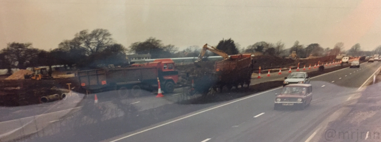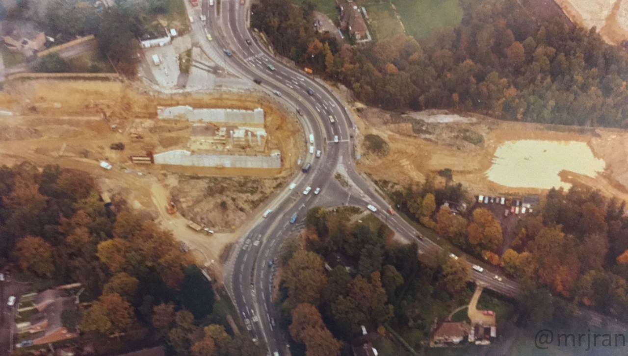M27 J4 at Bassett in 1984. Towards the bottom is Rownhams services while the link to the M3 is at the top. The M27 through the junction, and through to Hedge End, was nicknamed the 'missing link' because it wasn't finished until the 1980s. It's under construction here, and the sign in the centre confirms it will be finished.