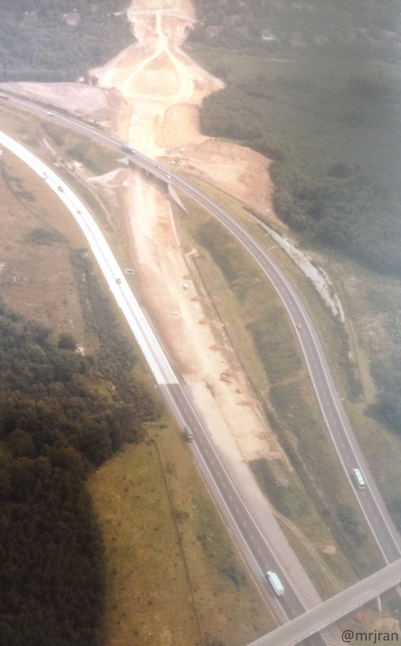 Looking east from the same spot. In the distance is the one mile advance sign for J9. From this point the work is more advanced, with the surface laid and the barriers in place.