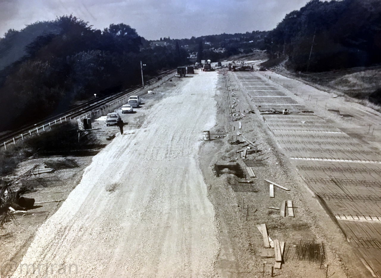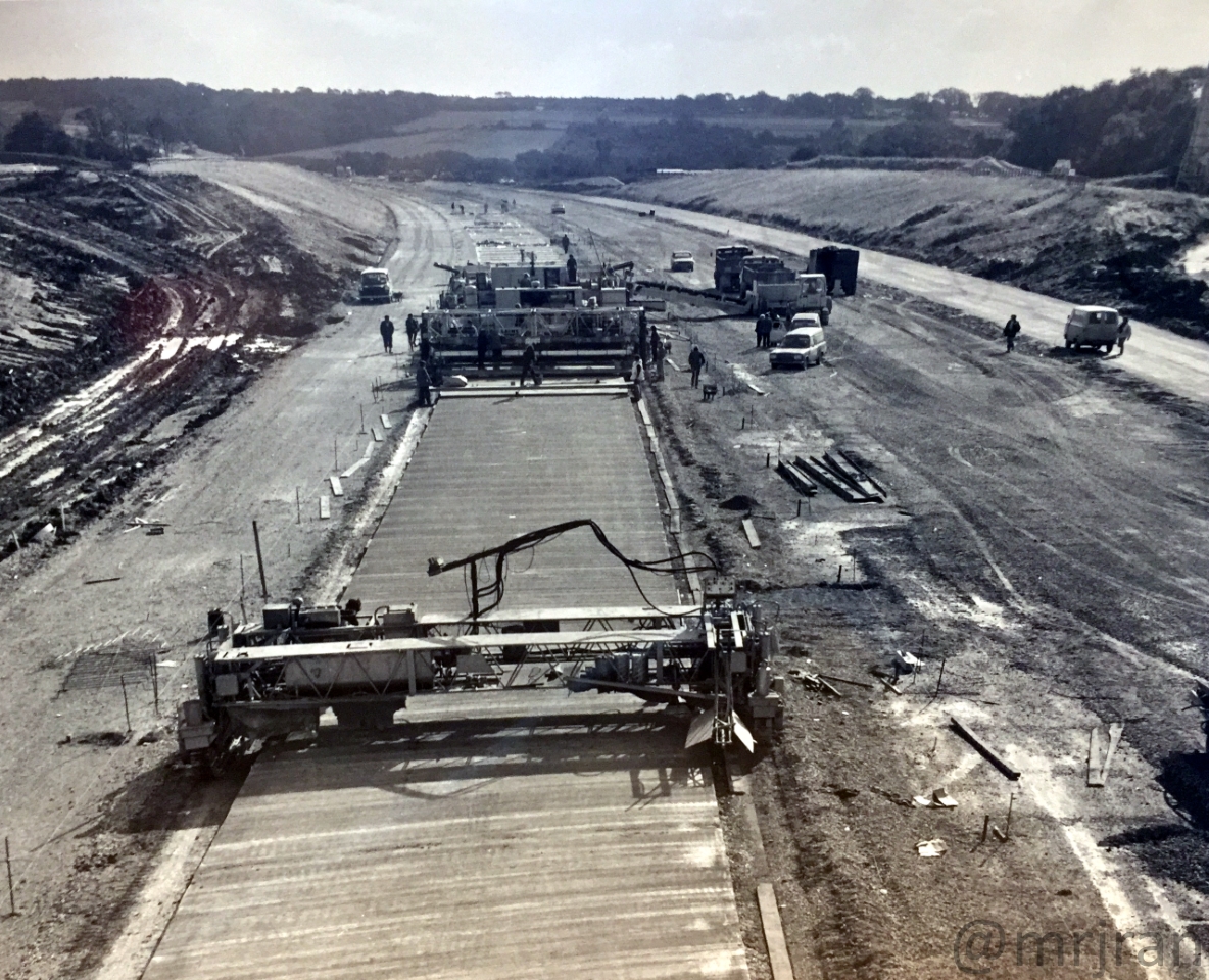 Looking east from Whiteley Lane. A machine is being used to prepare the concrete carriageway. Space has been cleared for the slip roads up to the never-built Meon services - those slip roads were quickly Tarmaced and painted, despite never being used.
