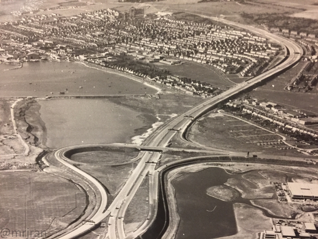 Looking west over J12 in 1975. Here work on the motorway is nearly complete but most of this part of Portsmouth has yet to be built, including both Port Solent and the retail parks along Southampton Road which are still houses here.